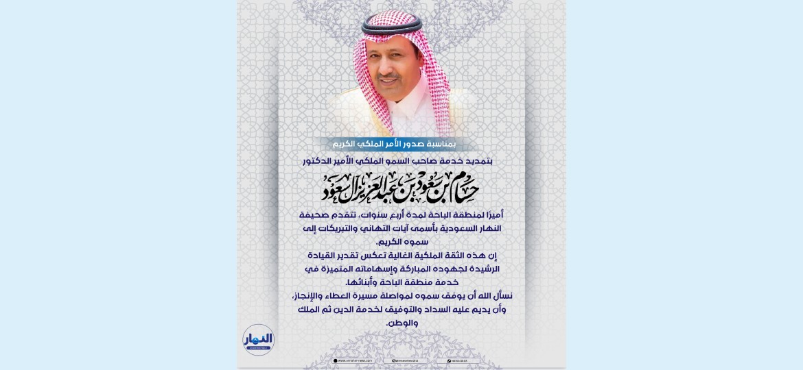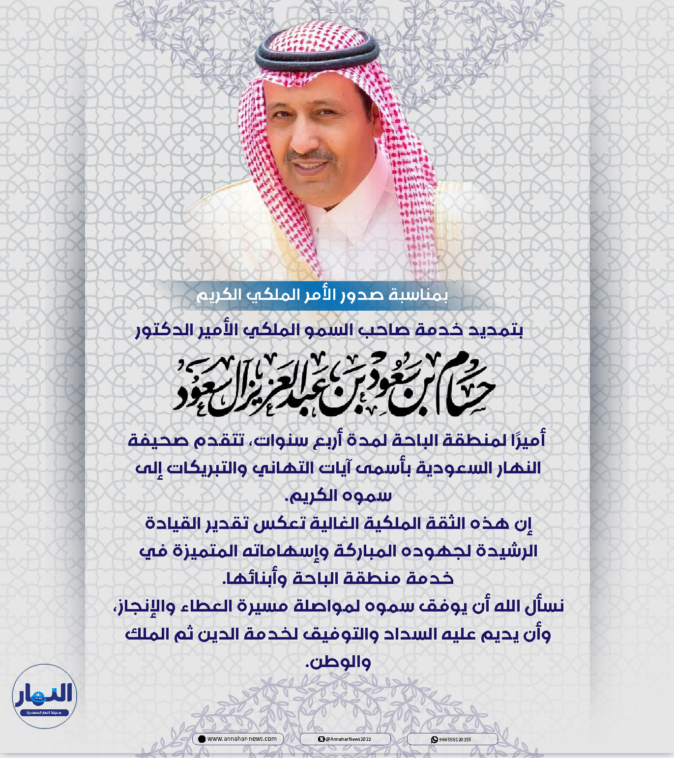 بمناسبة صدور الأمر الملكي الكريم بتمديد خدمة صاحب السمو الملكي الأمير الدكتور حسام بن سعود بن عبدالعزيز أميرًا لمنطقة الباحة لمدة أربع سنوات، تتقدم صحيفة النهار السعودية بأسمى آيات التهاني والتبريكات إلى سموه الكريم.