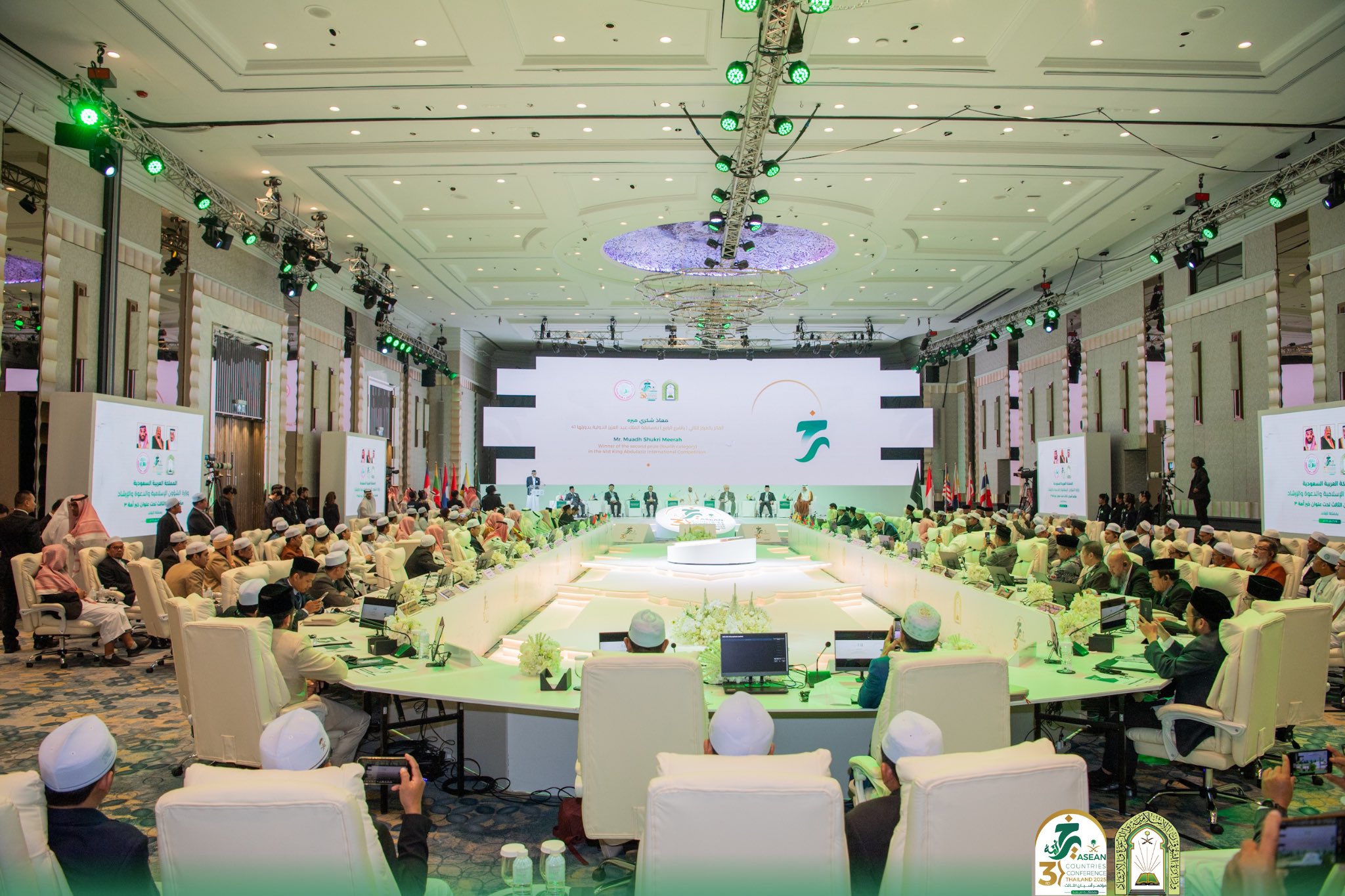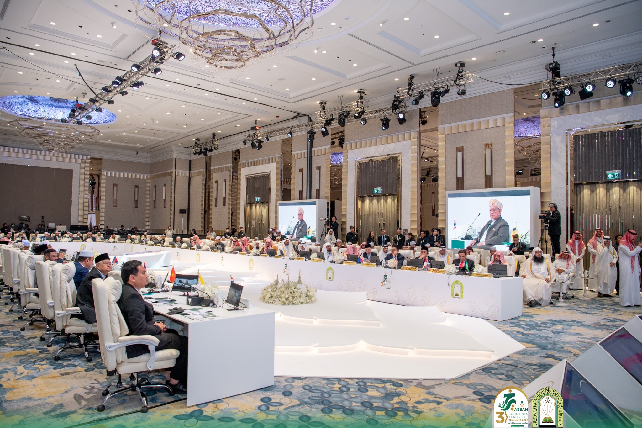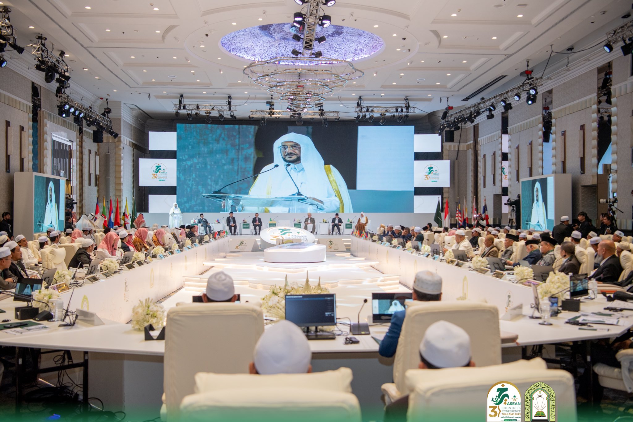 افتتح معالي وزير الشؤون الإسلامية والدعوة والإرشاد الشيخ الدكتور عبداللطيف بن عبدالعزيز آل الشيخ، اليوم السبت الخامس والعشرين من شهر رجب 1446هـ، المؤتمر الدولي الثالث لدول آسيان تحت عنوان “خير أمة”، الذي تنظمه وزارة الشؤون الإسلامية والدعوة والإرشاد في العاصمة التايلاندية بانكوك في دورته الحالية، بمشاركة وزراء ومفتين ورؤساء الجامعات والمراكز والجمعيات الإسلامية، وقيادات دينية وثقافية في دول آسيان. وألقى معالي الوزير الدكتور عبداللطيف آل الشيخ كلمة المملكة في حفل الافتتاح الرسمي للمؤتمر، الذي شهد حضور وتشريف معالي رئيس البرلمان بمملكة تايلاند السيد وان محمد نور ماثا.