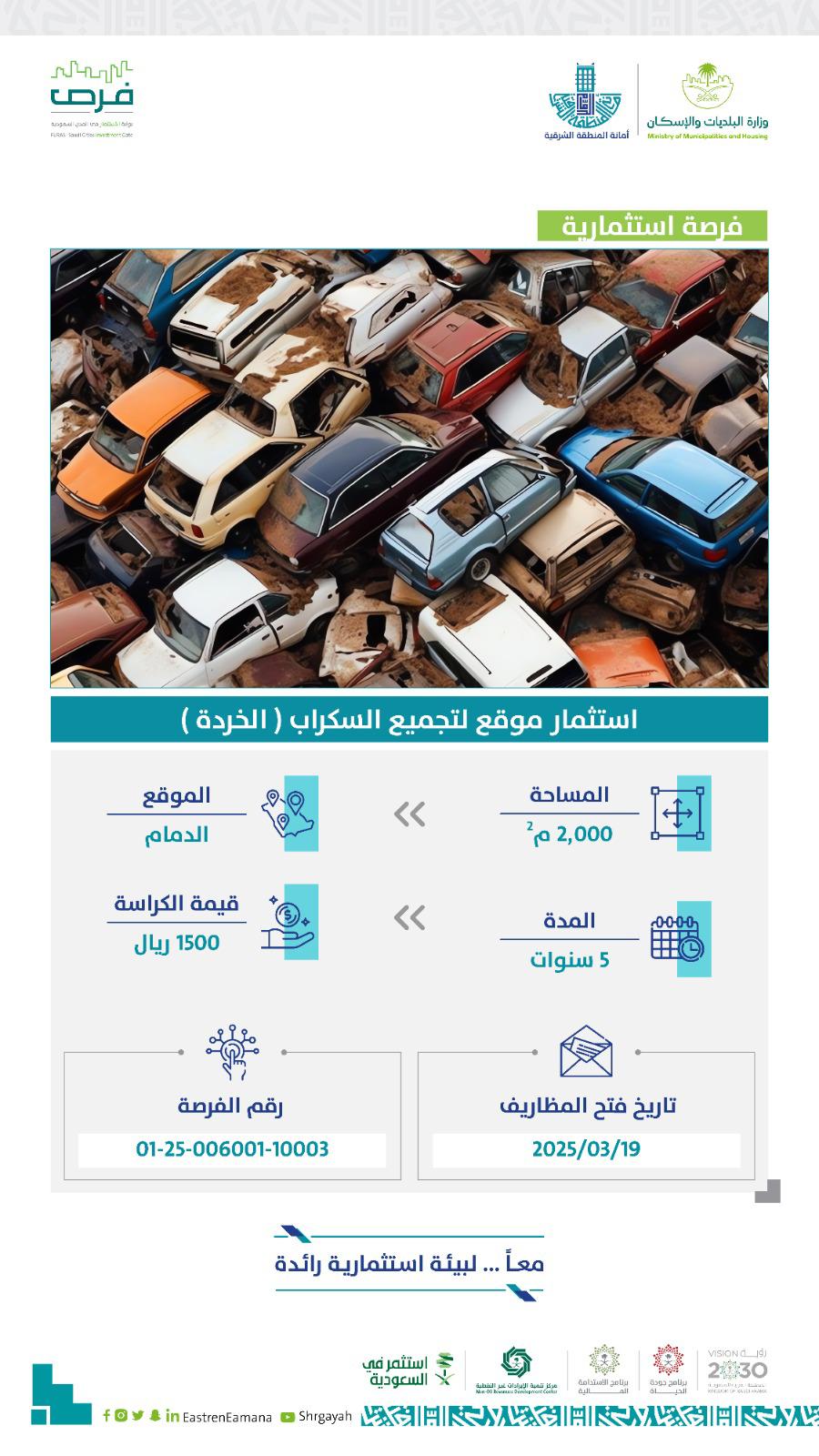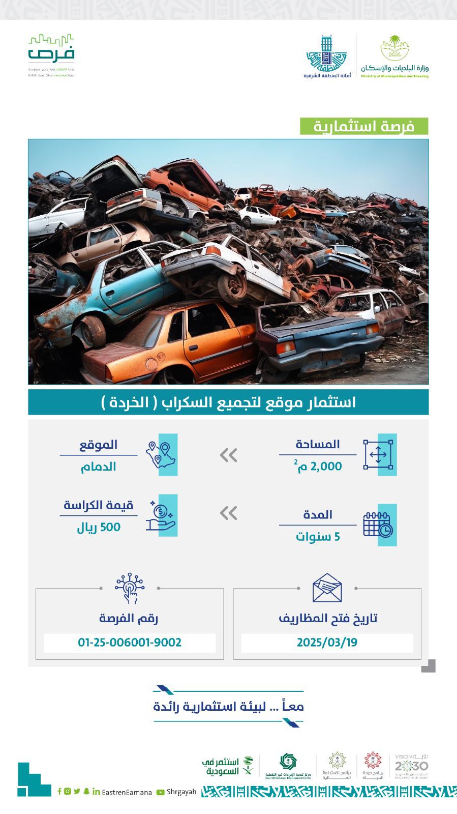 من أبرز هذه الفرص الاستثمارية موقعين لتجميع السكراب (الخردة) في الدمام، بمساحة 2.000 متر مربع ومدة عقد تصل إلى 5 سنوات، مما يوفر فرصًا للمستثمرين في قطاع إعادة التدوير، حيث يتيح بيئة ملائمة لتحفيز الاستثمارات في هذا القطاع الحيوي.