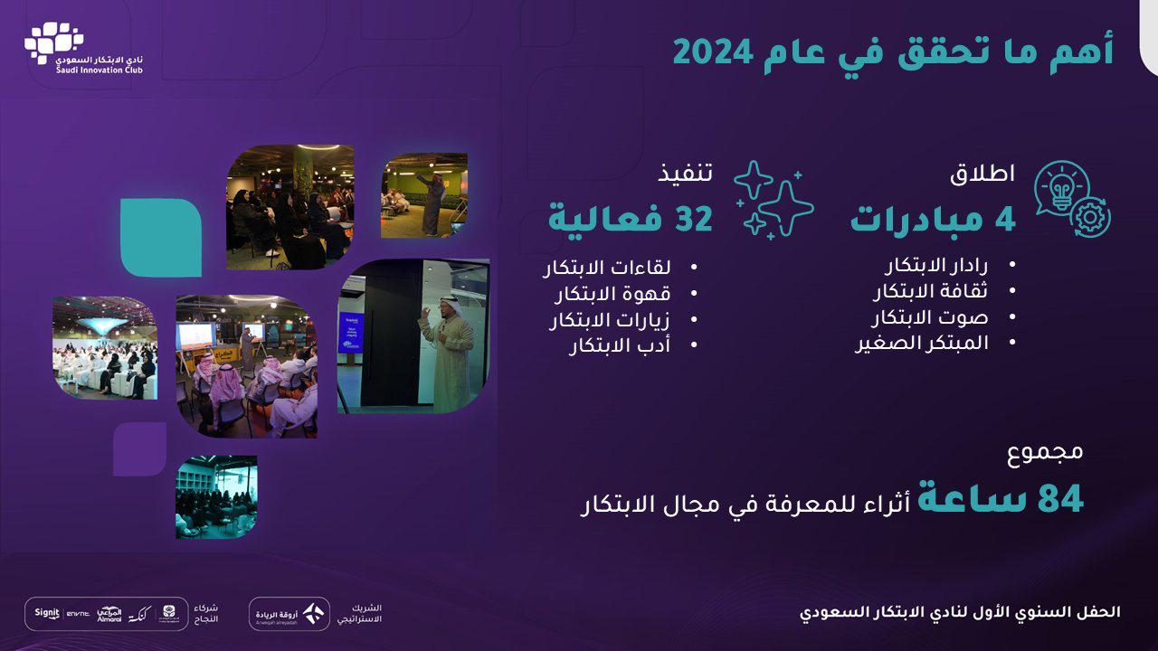 نادي الابتكار السعودي في عامه الأول يتصدر أندية الهواة في المملكة حيث انتهى عام 2024 م بأكثر من 720 عضو ومبدع ومبتكر في جميع مناطق المملكة؛ ليلفت الأنظار ويلقى الإعجاب ويستقطب الشراكات النوعية الداعمة لأنشطة وفعاليات ومبادرات النادي ، حيث أطلق النادي 4 مبادرات ( رادار الابتكار ، ثقافة الابتكار ، صوت الابتكار، المبتكر الصغير) ، ونفذ 32 فعالية ( لقاءات الابتكار، قهوة الابتكار، زيارات الابتكار، أدب الابتكار)؛ والتي أسهمت في تحقيق 84 ساعة إثراء للمعرفة في مجال الابتكار .