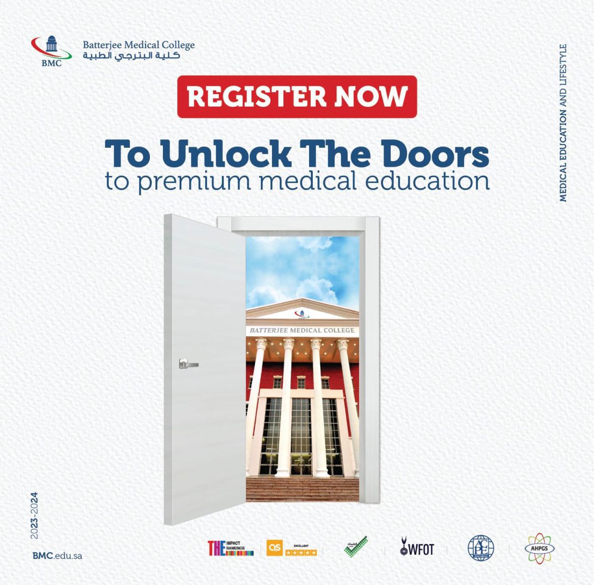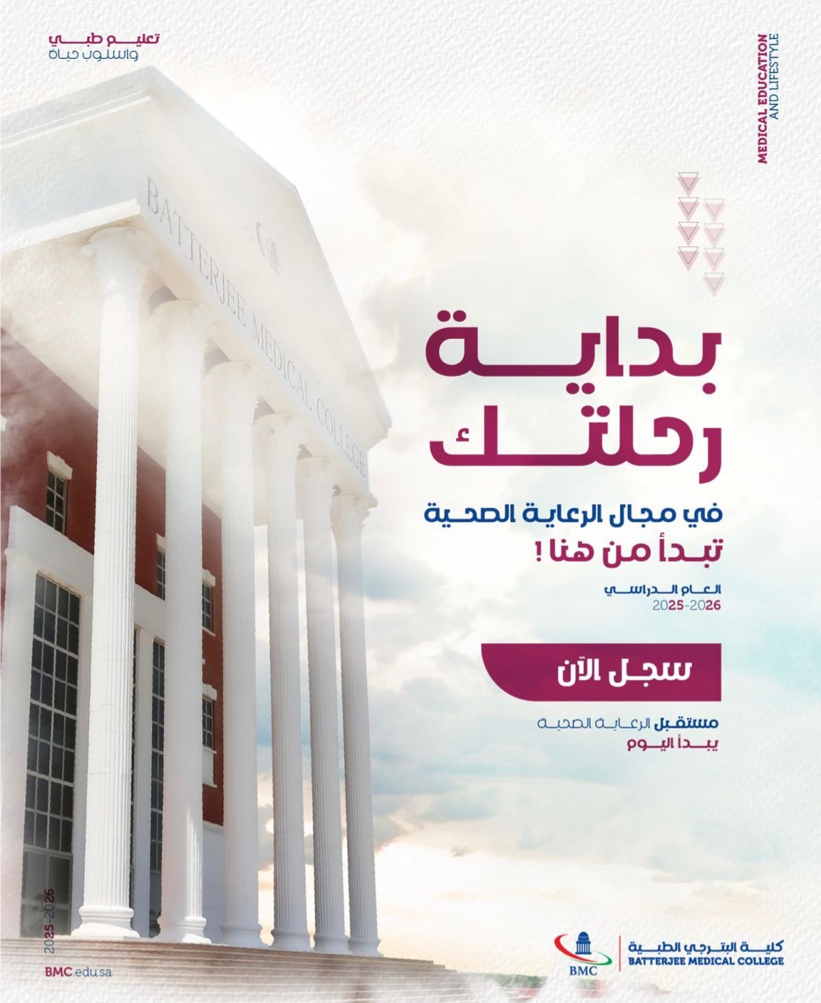 كذلك يمكن للطلبة المستوفين للشروط التي وضعتها وزارة التعليم التقديم عن طريق البوابة الإلكترونية للكلية www.bmc.edu.sa. لتسهيل عملية التسجيل والقبول للراغبين في الانضمام للكلية من أي مكان في المملكة عن طريق تعبئة نموذج التسجيل وإتباع الخطوات المطلوبة،