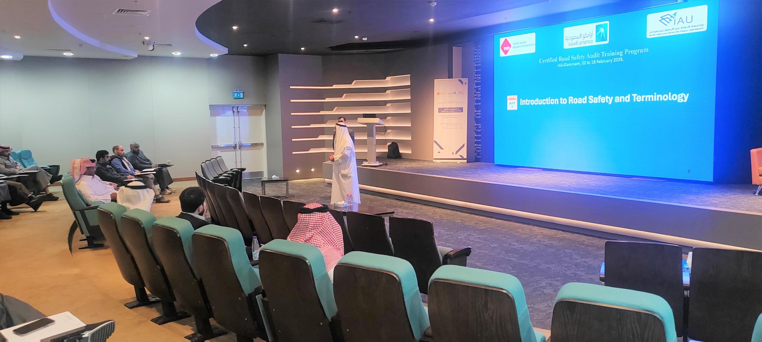 وأوضح الدكتور عبد الحميد المعجل، المشرف على الكرسي بأن كرسي أرامكو للسلامة المرورية بجامعة الإمام عبدالرحمن بن فيصل، أطلق بالتعاون مع مؤسسة أبحاث إصابات المرور«TIRF» في كندا، وهي مؤسسة دولية تأسست عام 1963 ومعترف بها دولياً كمؤسسة بحث علمي مستقلة مهتمة بإجراء بحوث علمية حول سلوكيات مستخدمي الطريق ونقل المعرفة بين المتخصصين، دورة تدقيق سلامة الطرق لمدة 10 أيام يمنح المشاركين شهادة معتمدة ومعترف بها دوليا يسمح لمن تجاوز الاختبارات اثناء ونهاية الدورة، صفت عضو مراقب في فريق تدقيق سلامة الطرق، ومسؤولا عن مساعدة قائد فريق التدقيق في فحص الرسومات التصميمية للطرق والتقاطعات بدقة و فحص الموقع (ليلاً ونهارًا)، ومساعدة قائد الفريق في إكمال عملية التدقيق في الوقت المناسب وبطريقة احترافية، مشيراً بان هذه الدورة تضاف الى سلسلة دورات يقوم بها الكرسي من اجل تقديم معارف علمية جديدة تتعلق بسلامة الطرق، يقدمها خبراء ومختصون في المجال.
