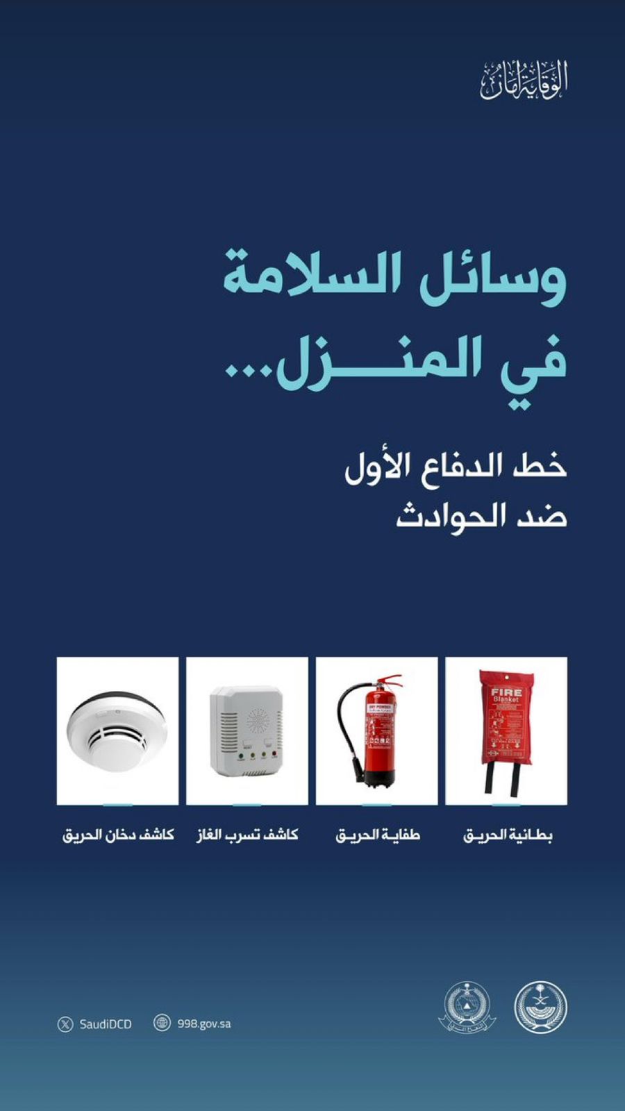 أكّدت المديرية العامة للدفاع المدني أهمية توافر أدوات السلامة في المنزل للحدّ من وقوع حوادث الحريق، ودورها في سلامة الإنسان والمحافظة على الممتلكات، وهي كاشف الدخان وبطانية الحريق، وطفاية الحريق وكاشف تسرب الغاز.