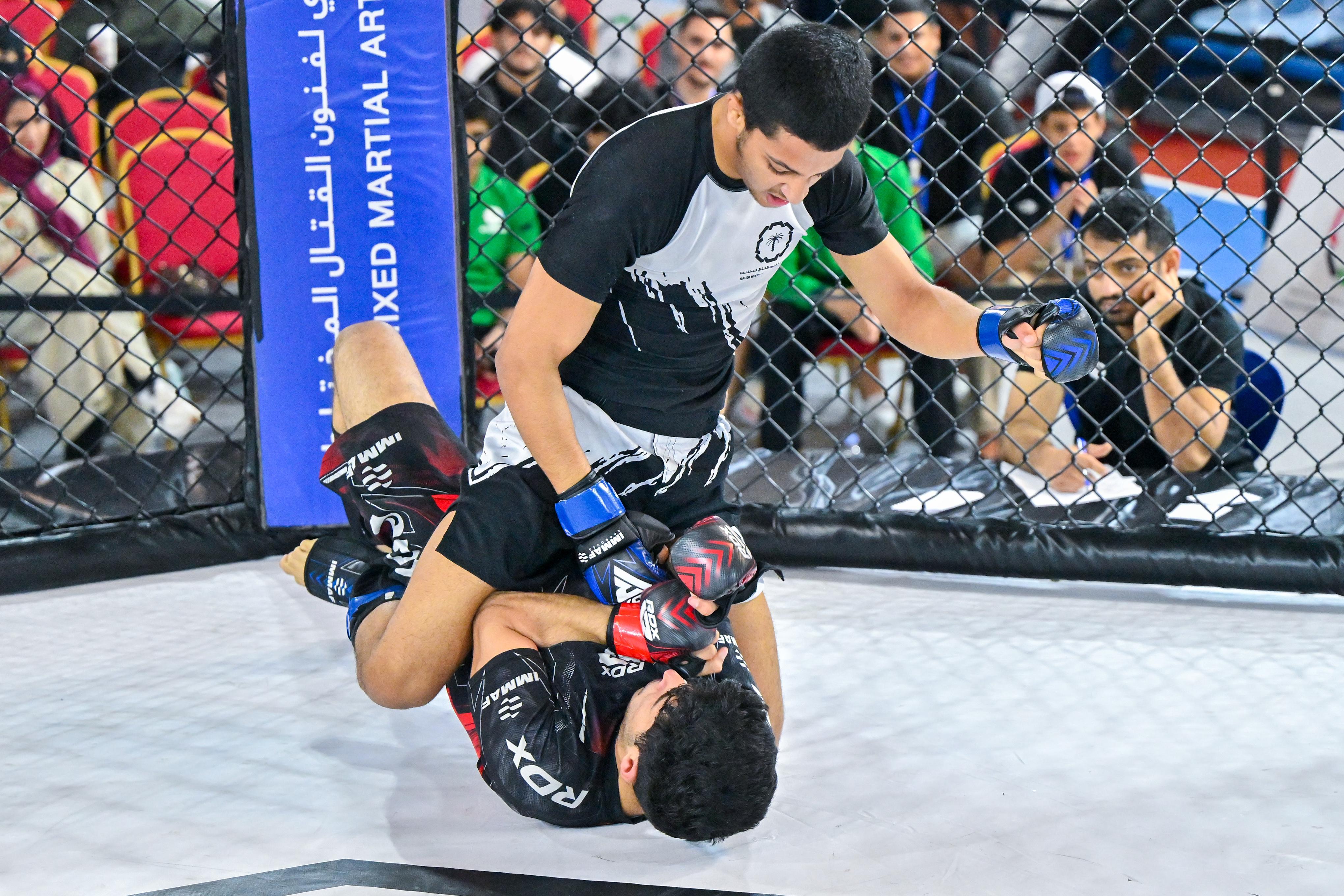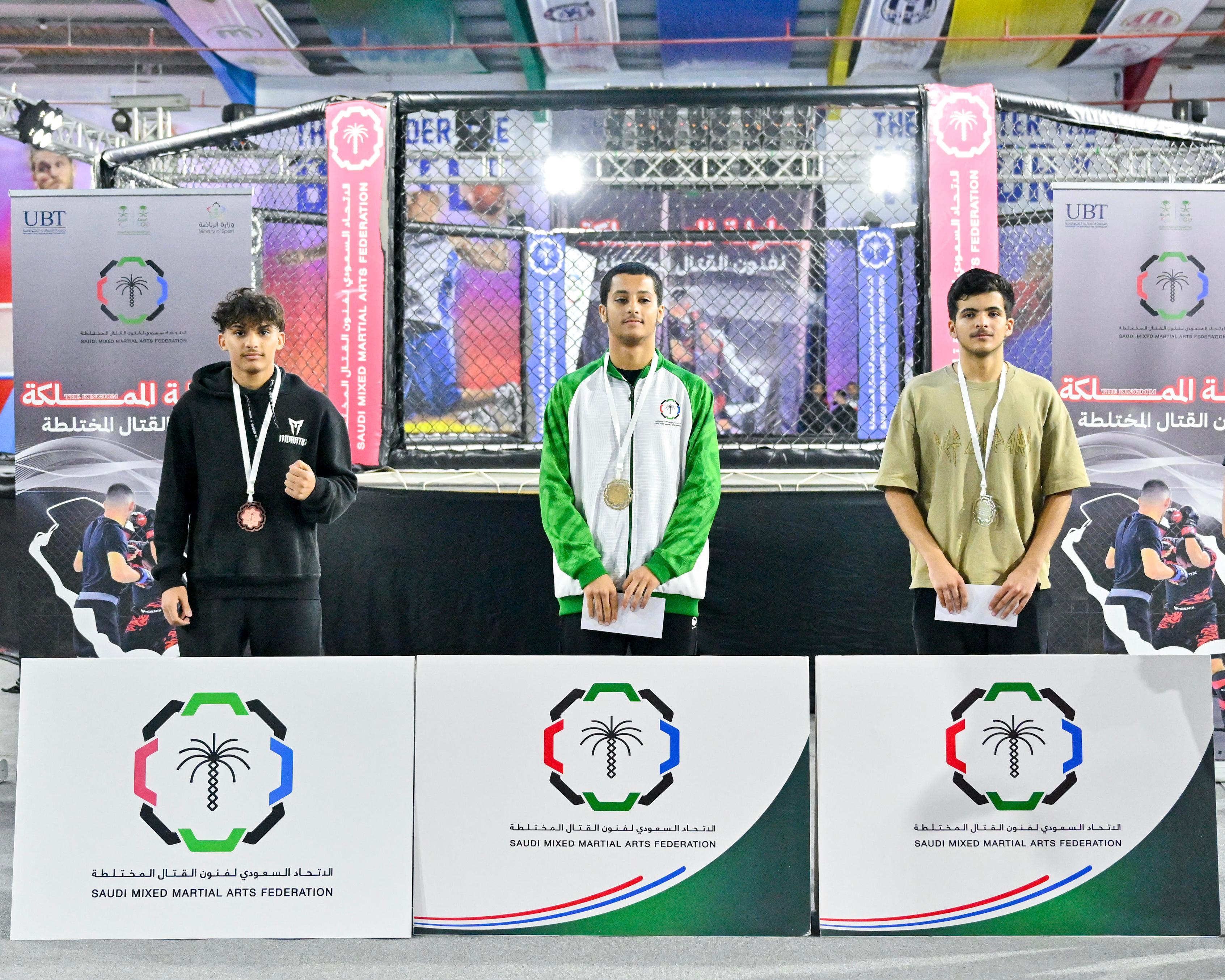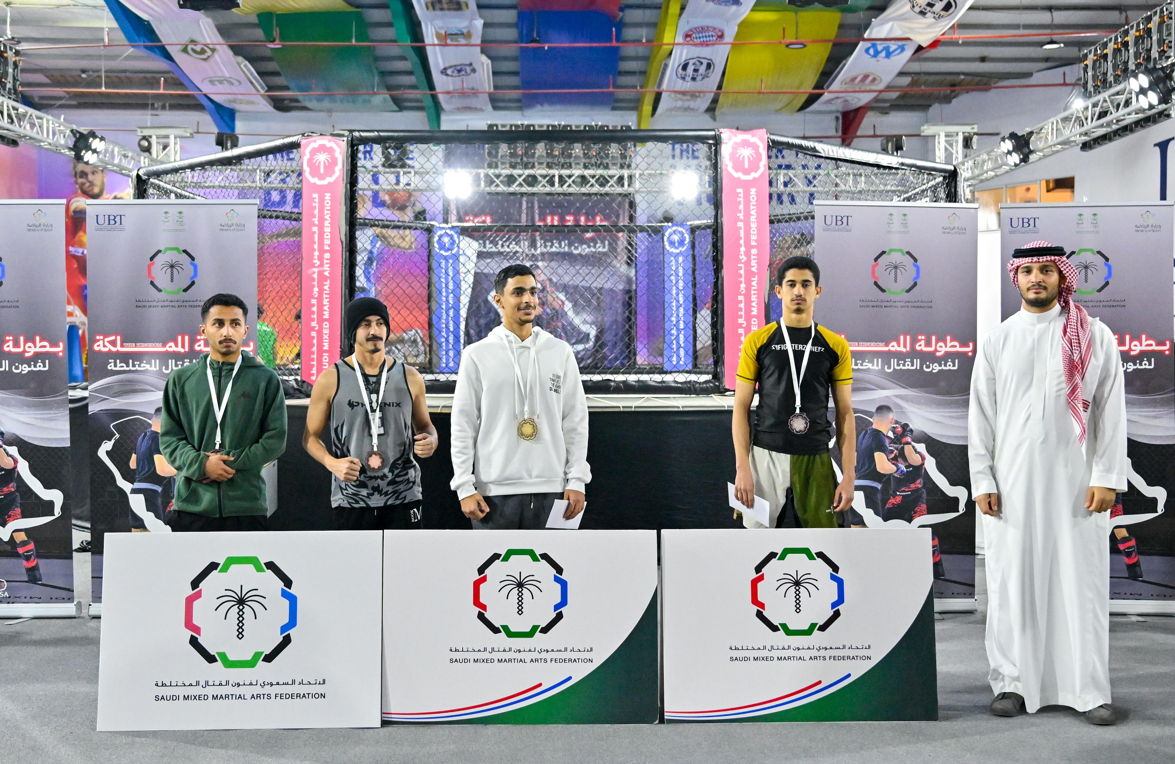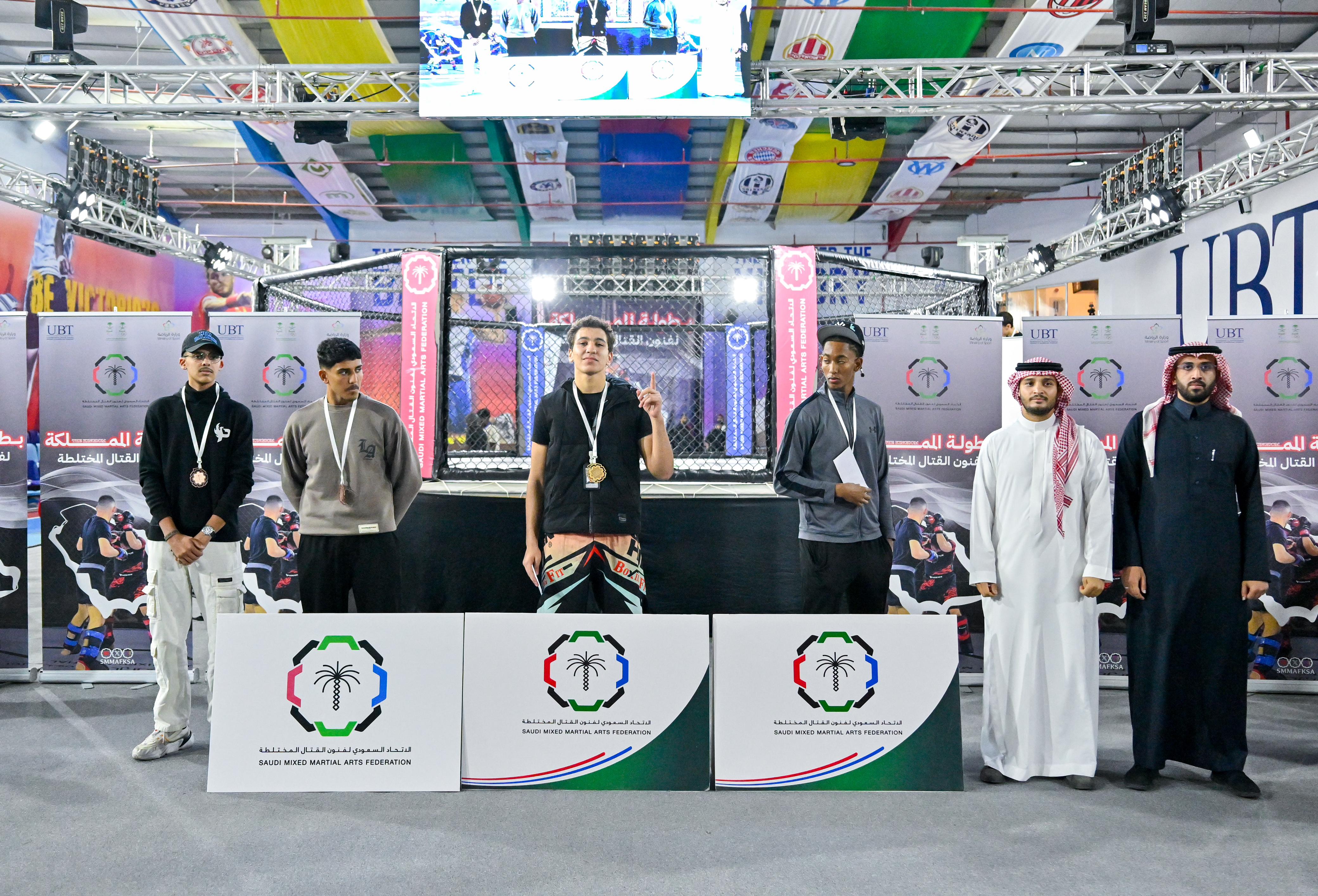 توِّج رئيس الاتحاد السعودي لفنون القتال المختلطة عبدالعزيز جليدان والمدير التنفيذي للاتحاد عبدالله الهزاع، يوم أمس، الفائزين في بطولة المملكة لفنون القتال المختلطة للفئات الثلاث (ناشئين وشباب وكبار ) التي أقيمت على صالة جامعة الأعمال والتكنولوجيا بمحافظة جدة.