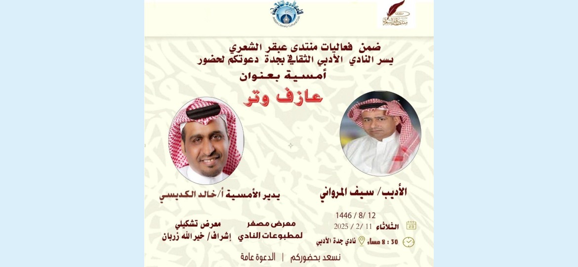 ضمن أنشطة وفعاليات النادي الأدبي بجدة يقيم منتدى عبقر الشعري أمسية شعرية بعنوان "عازف وتر " للشاعر سيف المرواني، ويديرها نائب منتدى عبقر الزميل الشاعر والقاص والأديب خالد الكديسي وذلك مساء الليلة الثلاثاء ١٢/ ٨/ ١٤٤٦ الموافق ١١/ ٢ / ٢٠٢٥م في تمام الساعة الثامنة والنصف مساء وذلك بمقر النادي وعلى هامش الأمسية سيكون هناك معرض مصغر لمطبوعات النادي وتشكيلي يشرف عليه الزميل الفنان خير الله زربان .