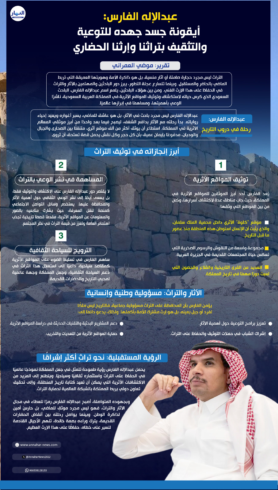 وبجهوده المتواصلة، أصبح عبدالإله الفارس رمزًا للعطاء في مجال الآثار والتراث، فهو ليس مجرد موثقٍ للماضي، بل حارسٌ أمين لذاكرة الوطن. وبينما يواصل رحلته بين أنقاض الحضارات القديمة، يترك وراءه بصمة خالدة، تلهم الأجيال القادمة للسير على خطاه، حفاظًا على هذا الإرث العظيم.