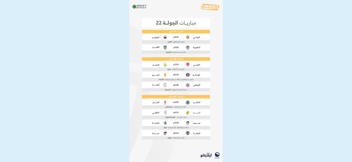 الزلفي × الجبلين: يسعى الزلفي (13 برصيد 23 نقطة) لإنهاء سلسلة 4 جولات دون فوز، بينما يبحث الجبلين (5 برصيد 35 نقطة) عن استعادة الانتصارات.