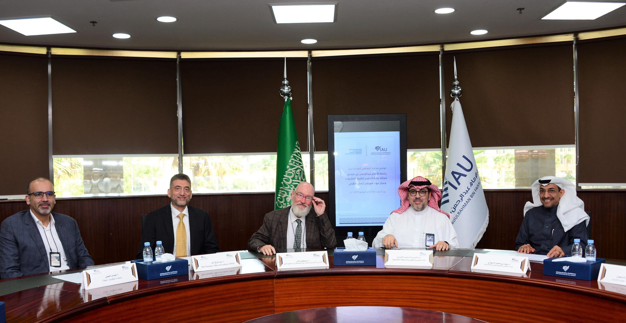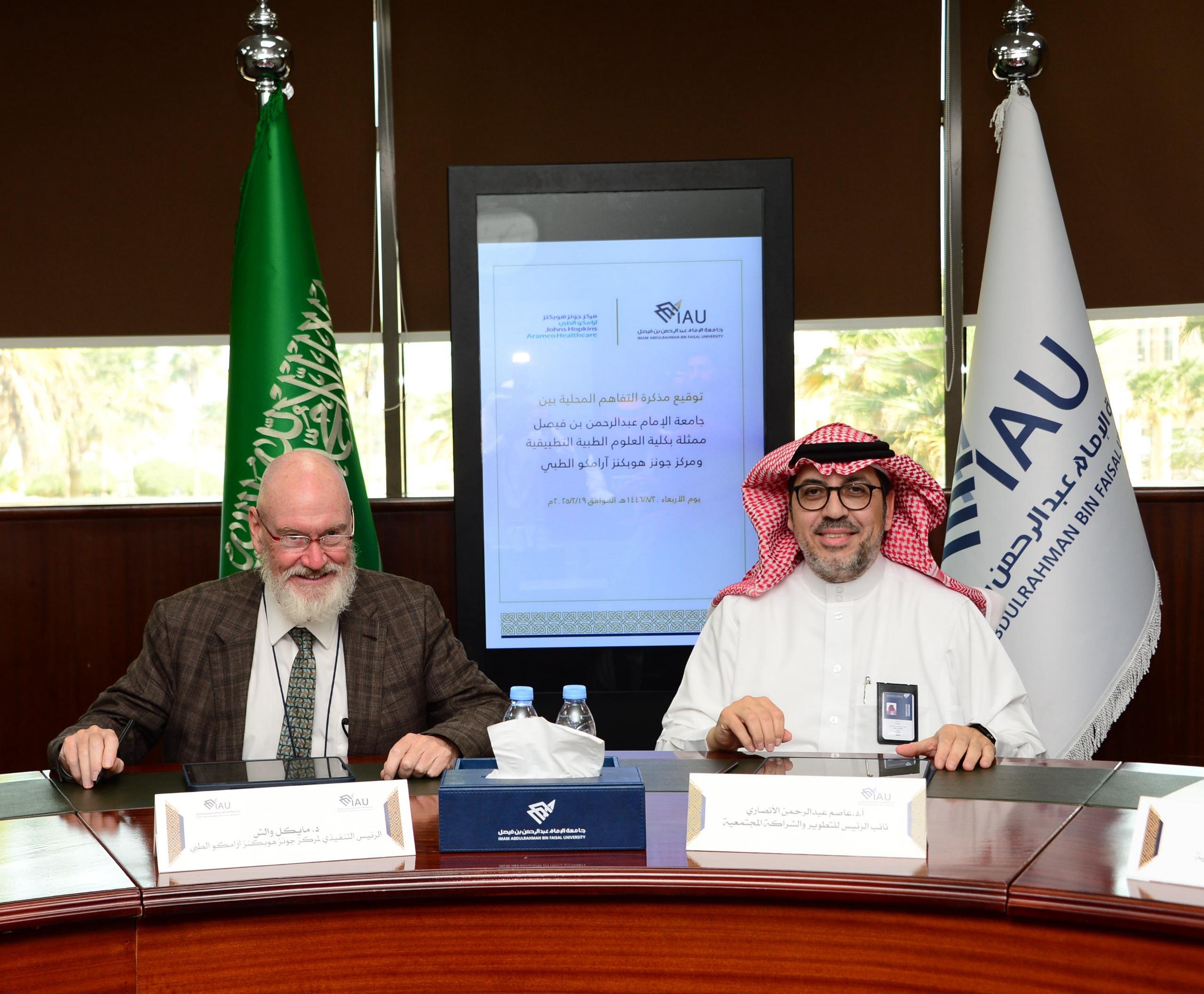 أبرمت جامعة الإمام عبد الرحمن بن فيصل ومركز جونز هوبكنز أرامكو الطبي مذكرة تفاهم في عددا المجالات حيث وقع المذكرة من الجامعة القائم بأعمال نائب الرئيس للتطوير والشراكة المجتمعية الأستاذ الدكتور عاصم بن عبدالرحمن الأنصاري ومن المركز الدكتور مايكل والش الرئيس التنفيذي لمركز جونز هوبكنز ارامكو الطبي ، بحضور عميد كلية العلوم الطبية التطبيقية د .سعد السعدي ، و د. لمياء الصيخان رئيسة قسم تقنية القلب ووكيلة الكلية للبحث العلمي والابتكار ، و د. سارة بنت علي الدليجان مديرة وحدة الشراكات المحلية والدولية ، و د. طفيل اليوسف مدير مركز الاتصال والاعلام.