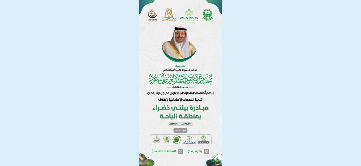 تحت رعاية صاحب السمو الملكي الأمير الدكتور حسام بن سعود بن عبد العزيز أمير منطقة الباحة تنظم أمانة منطقة الباحة بالتعاون مع جمعية رغدان للتنمية والخدمات الاجتماعية لإطلاق مبادرة السعودية الخضراء بمنطقة الباحة بعد عصر يوم غد الأربعاء