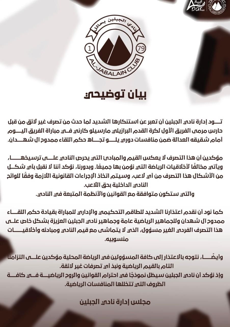 كما أدان نادي الجبلين، أحد أندية دوري الدرجة الأولى السعودي، التصرف غير اللائق الذي قام به حارس مرمى الفريق، البرازيلي مارسيلو كارني، تجاه حكم مباراة الفريق أمام العدالة، والتي انتهت بفوز الأخير 2-1.