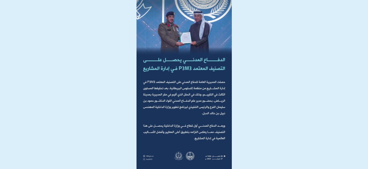 ويعد الدفاع المدني أول قطاع في وزارة الداخلية يحصل على هذا التصنيف، مما يعكس التزامه بتطبيق أعلى المعايير وأفضل الأساليب العالمية في إدارة المشاريع.