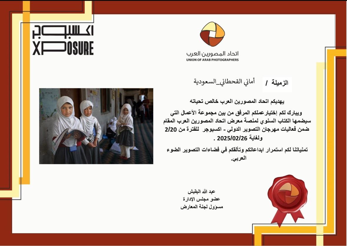 فازت عضو جمعية إعلاميون المصورة الفوتغرافية السعودية أماني القحطاني، بأن تكون صورتها "تحدي الجهل" ضمن مجموعة الأعمال التي سيضمها الكتاب السنوي لمنصة معرض اتحاد المصورين العرب، المقدم إلى مهرجان التصوير الدولي - "اكسبوجر" الذي تم خلال شهر فبراير ٢٠٢٥.