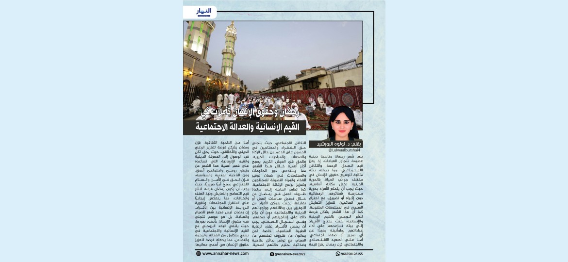 إن رمضان ليس مجرد شهر للصيام والعبادة، بل هو موسم تتجلى فيه حقوق الإنسان بأبهى صورها، حيث يلتقي البعد الروحي مع القيم الإنسانية والاجتماعية في نسيج متكامل من العدالة والرحمة والتضامن، مما يجعله فرصة لتعزيز حقوق الإنسان في أسمى معانيها.