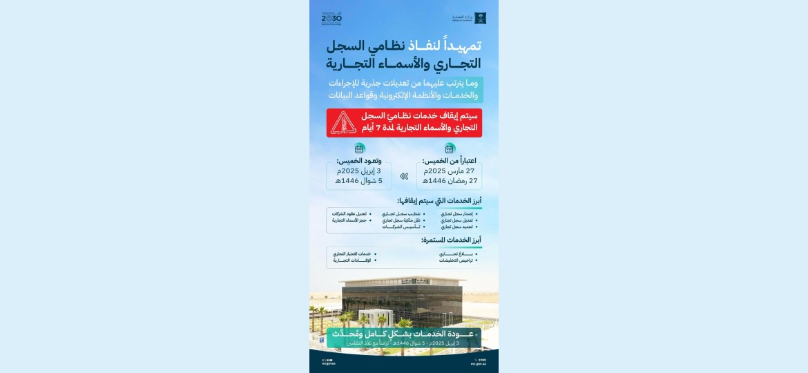 أعلنت وزارة التجارة عن إيقاف الخدمات ذات الصلة المباشرة بنظامي السجل والأسماء التجارية لمدة 7 أيام، اعتبارًا من 27 مارس، حتى 3 أبريل 2025م.
