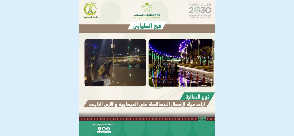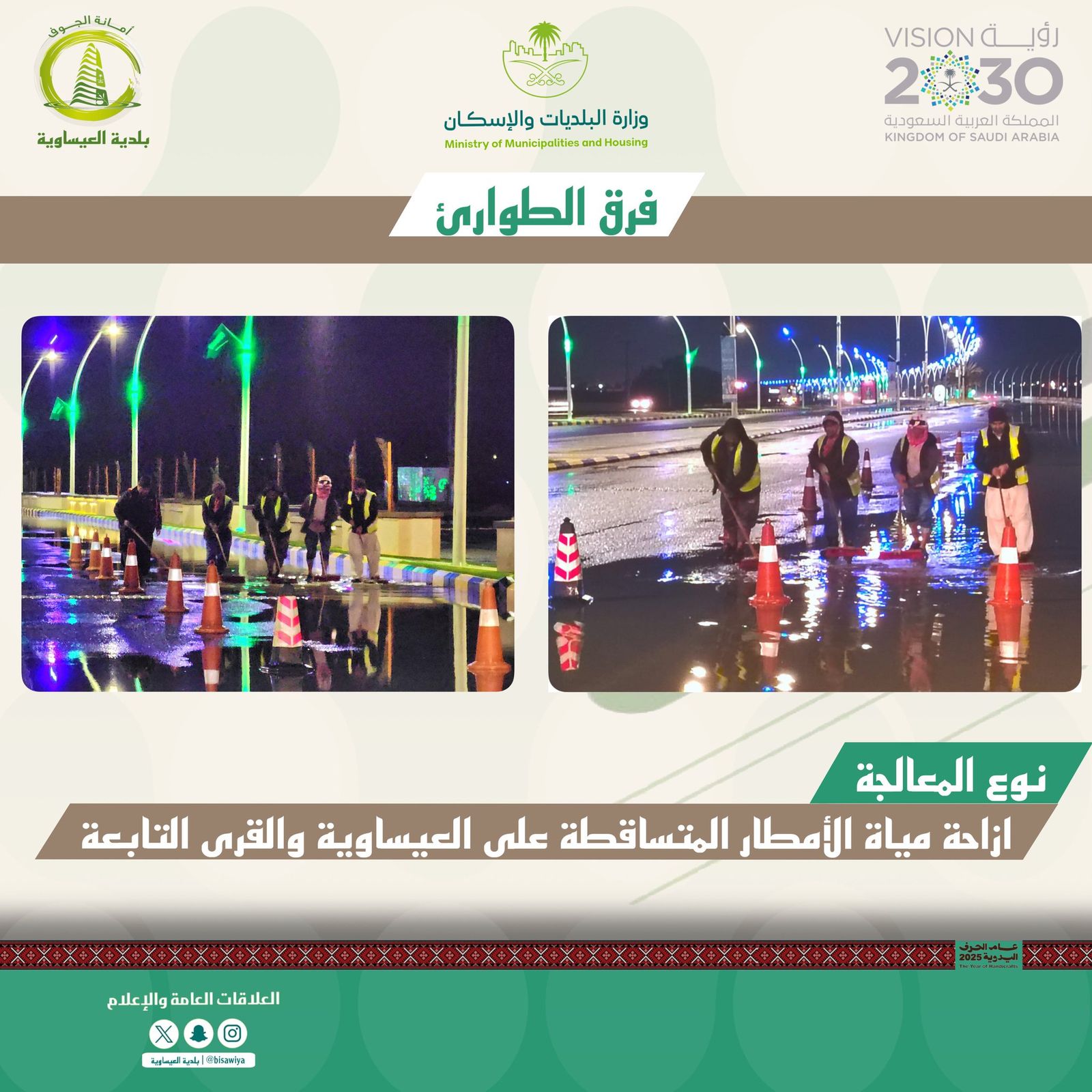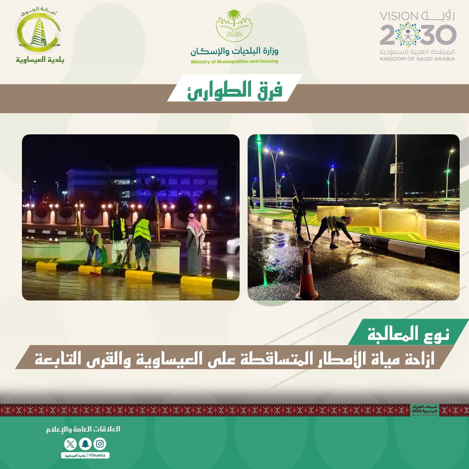 قامت بلدية مركز العيساوية التابعة لأمانة منطقة الجوف بمواصلة أعمالها الميدانية بازالة تجمعات مياه الأمطار وآثارها من المواقع غير المخدومة بشبكة تصريف مياه الأمطار من خلال عدة فرق ميدانية، كما تم الانتهاء من رفع تجمعات مياه الأمطار في بعض المواقع غير المخدومة بشبكات تصريف مياه الأمطار، وجارٍ العمل على شفطها من المواقع الأخرى، وذلك بمتابعة ميدانية من رئيس بلدية العيساوية المهندس فارس بن حمود الجباب.