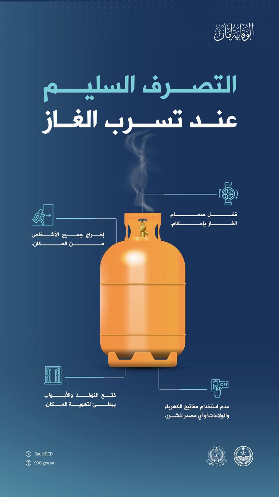 أوضحت المديرية العامة للدفاع المدني، أهمية الالتزام بإجراءات السلامة عند تسرب الغاز، وضرورة عدم استخدام مفاتيح الكهرباء أو أي مصدر قد يسبب الاشتعال، وإخلاء المكان فورًا، مع إحكام إغلاق صمام الغاز وتهوية الموقع بفتح النوافذ والأبواب ببطء، وتركيب أجهزة كشف تسرب الغاز في المنازل والمنشآت لحماية الأرواح والممتلكات.