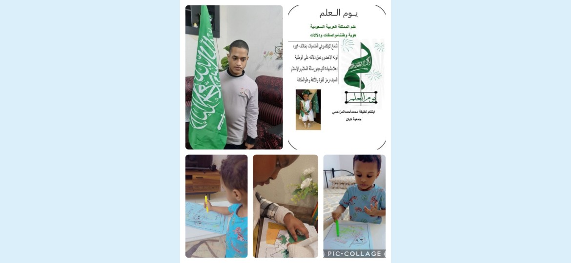 قالت الأم الحاضنة أم زياد عمر حسن عبد الرحمن: العلم السعودي فخرنا وعزنا وسعداء الاحتفال بيوم العلم الراية الخفاقة دوما، ولله الحمد في سن مبكرة أغرس حب الوطن والعلم في قلب "ولدي زياد عمر" حتى يتغلغل حبه في قلبه، كما أعلمه كيف يحافظ على العلم من خلال توضيح بعض الأمور وبالتوجيه والإرشاد والتعليم في سن مبكر بأهمية العلم والحافظ عليه، وأحثه على ترديد النشيد الوطني، ورسم العلم.