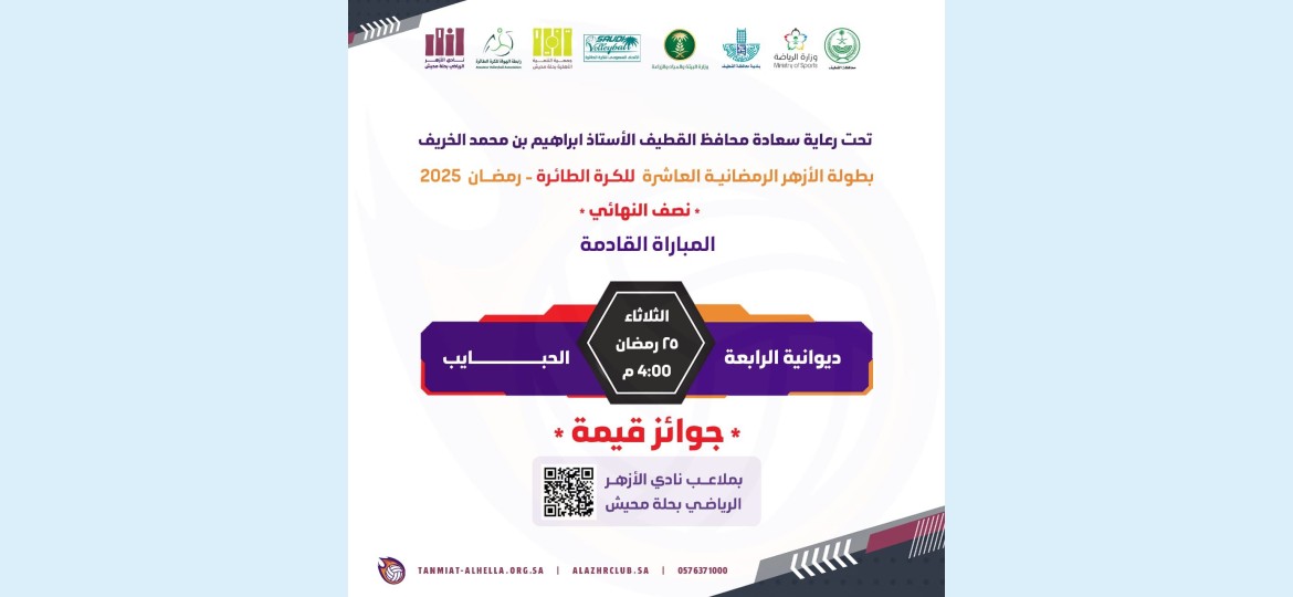 حيث تأتي هذه المباراة ضمن منافسات البطولة التي تنظمها جمعية التنمية الاجتماعية بحلة محيش ونادي الأزهر الرياضي وتحظى برعاية كريمة من سعادة محافظ القطيف وبالشراكة مع بلدية القطيف ووزارة الرياضة ووزارة البيئة والمياه والزراعة والاتحاد السعودي لكرة الطائرة ورابطة الهواة لكرة الطائرة .