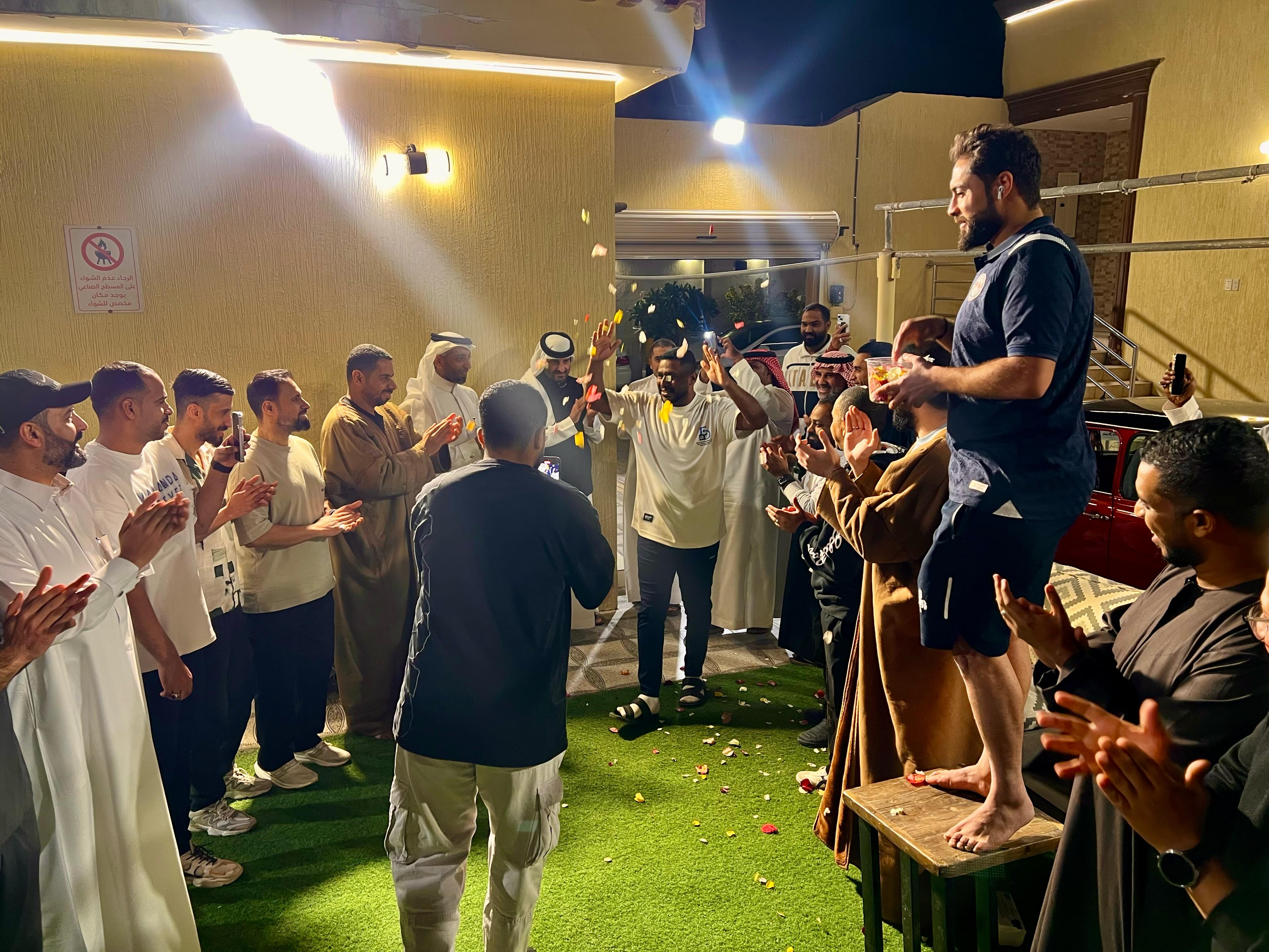 حيث بدأ الحفل بعمل ممر شرفي من جميع المشاركين مع وجود مفاجئة في آخر الممر بحضور والد المحتفى به والذي استقبل ابنه بكل سعادة وفخر للخطوة التي أقدم عليها البطل " حسين بوخضر " ثم تولى رئيس نادي التاج الاستاذ حسين البجحان مهمة تقديم فقرات الحفل بشكل مميز وعبارات تصل للقلب قبل الاذن مع مشاركة مجلس إدارة رابطة التعليق الاساتذة (محمد البخيتان، محمد العوض، عامر البوحيزة، علي الدليم) الذين تحدثوا عن مشاعرهم لهذا الحدث الكبير فيما شارك رئيس الرابطة الاستاذ سعد السبيعي بكلمة ارتجالية مقدماً مبلغ مالي للبطل "حسين" مع اشتراك مدى الحياة له ولعائلته في سلسلة مطاعم جونية، كما تم عرض مقطع مرئي بمونتاج مميز شارك فيه العديد من المعلقين لإيصال رسائل المحبة و الأخوة، بعدها قدم عضو رابطة التعليق الأخ أحمد الدريهم قصيدة شعرية يصف فيها حال البطل وردة فعل زملاءه، في الوقت الذي أبدى فارس الحفل "أبو علي" سعادته الكبيرة لكل هذه الحفاوة مبيناً أنه كان متابعاً لكل ردات الفعل في البطولات والمواقف التي من المستحيل نسيانها ، وفي ختام الحفل قدم كل مسؤول وعضو هدية تذكارية للبطل "حسين وابنه عبد الرحمن" مع تخصيص كامل مبلغ العيدية السنوية من رابطة التعليق للبطل حسين و عائلته الكريمة قبل التوجه لتناول وجبة السحور.