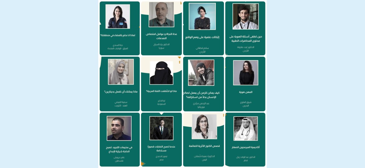 أما رزان زعيتر من فلسطين، فستشاركنا مبادرة “المقاومة الخضراء"، بينما يطلعنا تيمور الحديدي، من مصر، على كيفية "تحويل النفايات إلى تحف معمارية". ويشارك براء السراج، من سوريا، تجربته في امتصاص الصدمات وكيف انتقل بعدة نجاة من صنعه "من ظلمات السجن إلى نور المعرفة"، فيما ستنسج لنا شوق العلوي من البحرين، "حكايات المهن ".
