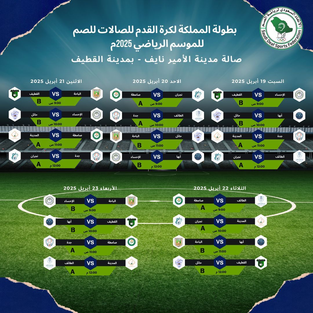 أعتمد الاتحاد السعودي لرياضة الصم البرنامج الزمني للموسم الجديد 2025 وتقرر انطلاق أولى البطولات في هذا الموسم في منتصف شهر أبريل المقبل حيث تقام بطولة المملكة لكرة القدم للصالات للصم على صالة مدينة الأمير نايف بالقطيف خلال الفترة من 21 إلى 26 شوال المقبل الموافق من من 19 إلى 24 أبريل 2025 بمشاركة 10 فرق تم توزيعها على مجموعتين ضمت المجموعة الأولى فرق " نادي الصم بجدة ،مركز الصم بالطائف , مركز الصم بصامطة ، مركز الصم بنجران ، مركز الصم بالمدينة المنورة " فيما ضمت المجموعة الثانية فرق " مركز الصم بالأحساء ، مركز الصم بأبهاء، مركز الصم بالباحة ، مركز الصم بحائل ، مركز الصم بالقطيف " .