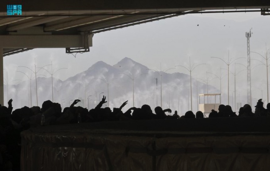 تُضخ نقاط رذاذ الماء الموزعة في أرجاء مشعر منى وتتطاير تلطيفاً للأجواء، وتخفيفاً للحرارة على جموع الحجاج.