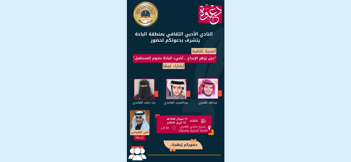 ضمن جهود نادي الباحة الأدبي الثقافي لإثراء المشهد الأدبي المحلي بدعم الطاقات الإبداعية وبواكير المواهب الشابة في مختلف المجالات ينظم النادي مساء الثلاثاء القادم الموافق 17 شوال 1446 هـ أمسية ثقافية تحمل عنوان "حين يزهر الإبداع تحتفي الباحة بنجوم المستقبل" بالتعاون مع الغرفة التجارية عند الساعة 8 والنصف مساء على مسرح ماشي العُمري.