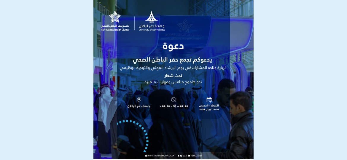 تحت رعاية سمو أمير المنطقة الشرقية صاحب السمو الملكي الأمير سعود بن نايف بن عبد العزيز ، يشارك تجمع حفر الباطن الصحي في جناح يوم الإرشاد المهني والتوجيه الوظيفي الذي سيقام في جامعة حفر الباطن يومي الأربعاء والخميس المقبلين.