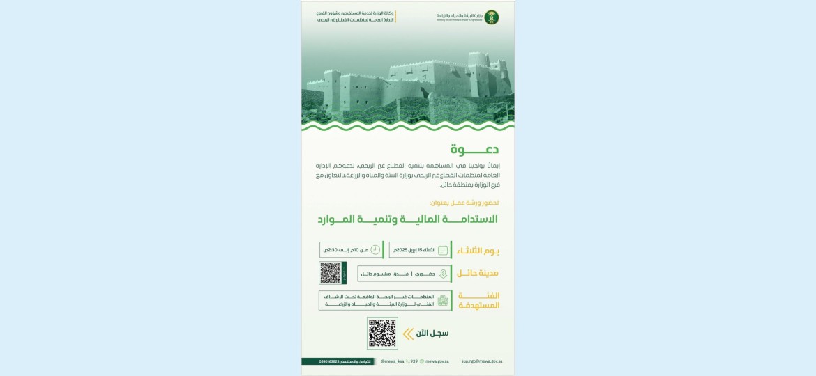 في إطار جهودها المستمرة لدعم وتمكين منظمات القطاع غير الربحي، تنظم وزارة البيئة والمياه والزراعة "ممثلة بالإدارة العامة لمنظمات القطاع غير الربحي"، وبالتعاون مع فرع الوزارة بمنطقة حائل ورشة عمل بعنوان “الاستدامة المالية وتنمية الموارد”، وذلك يوم الثلاثاء 15 أبريل 2025م، في فندق ميلينيوم بمدينة حائل، من الساعة 10 صباحاً حتى 2:30 ظهراً.