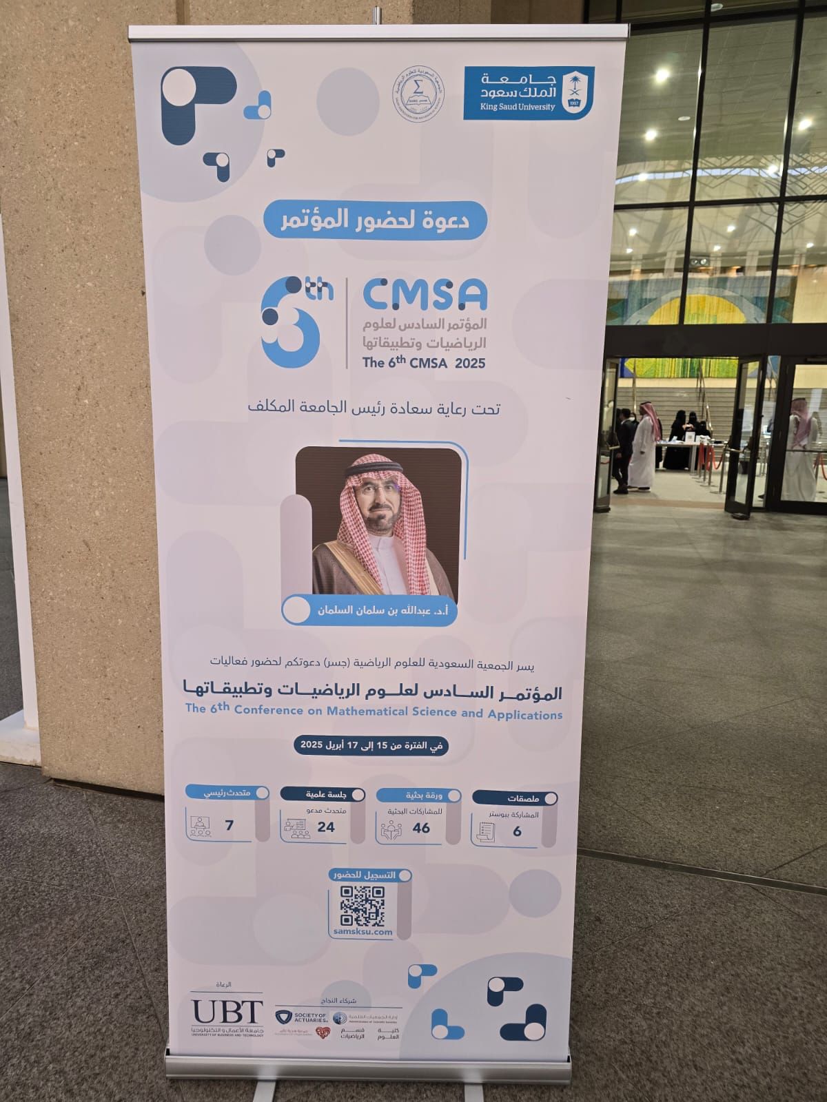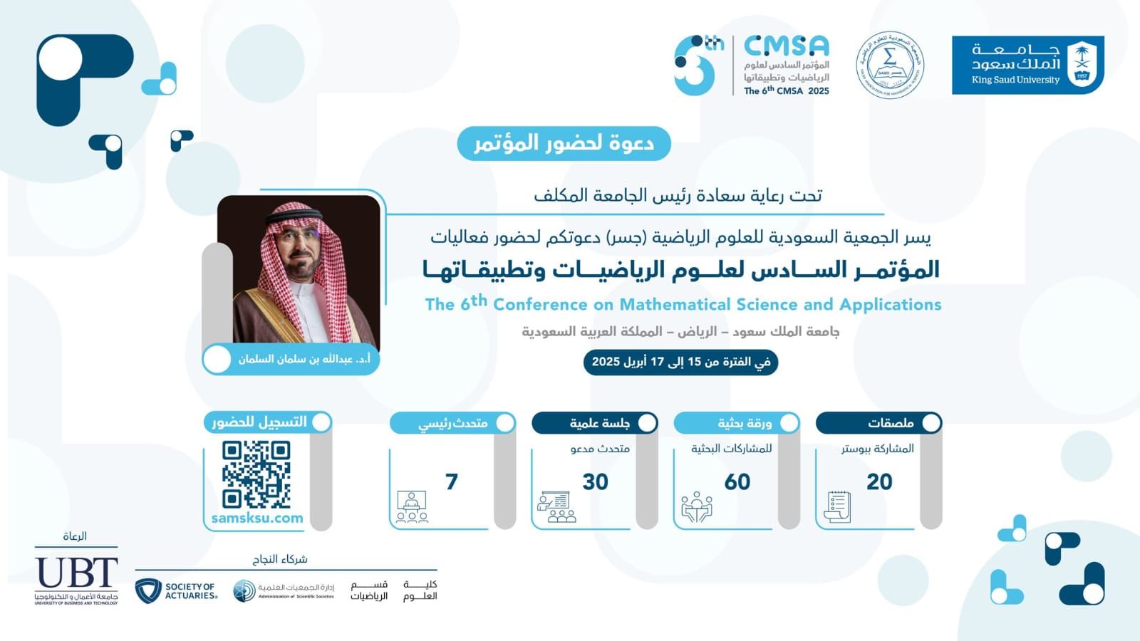 واستمراراً للنجاحات والإنجازات التي تمت في المؤتمرات السابقة والتي حظيت بتقدير كبير من قبل المشاركين من حيث التنظيم وجودة المساهمات العلمية المقدمة، تعتزم الجمعية السعودية للعلوم الرياضية (جسر) إقامة: المؤتمر السادس لعلوم الرياضيات وتطبيقاتها (6th CMSA 2025) والذي أقيمت في جامعة الملك سعود بالرياض في الفترة من 15 إلى 17 أبريل 2025.