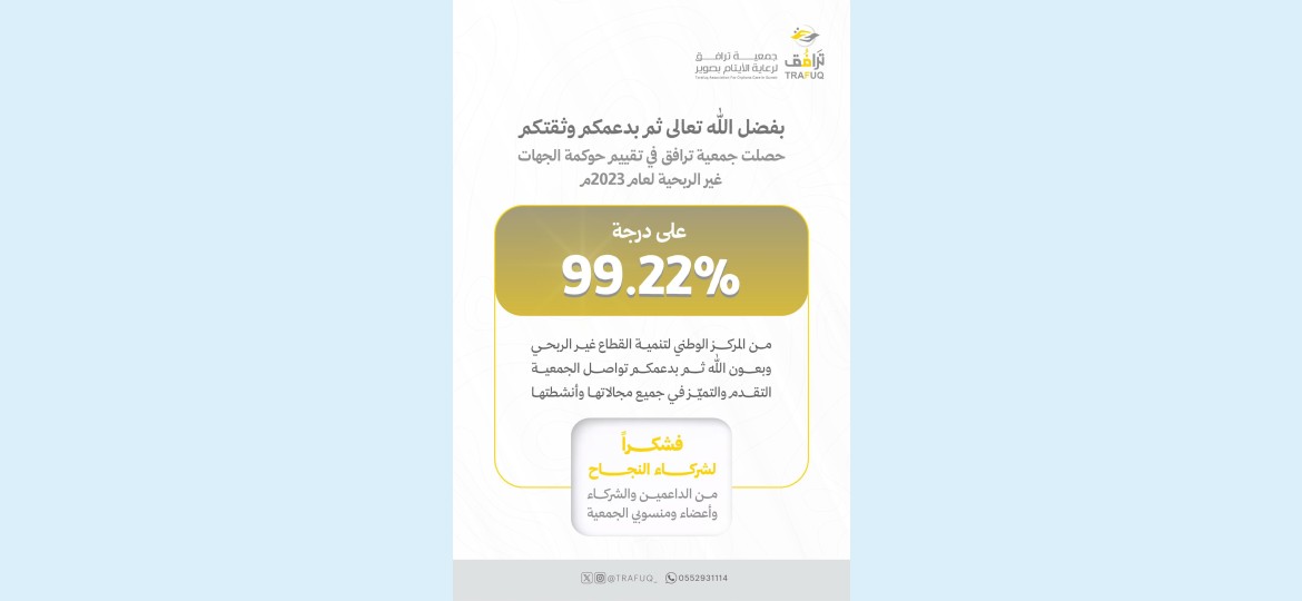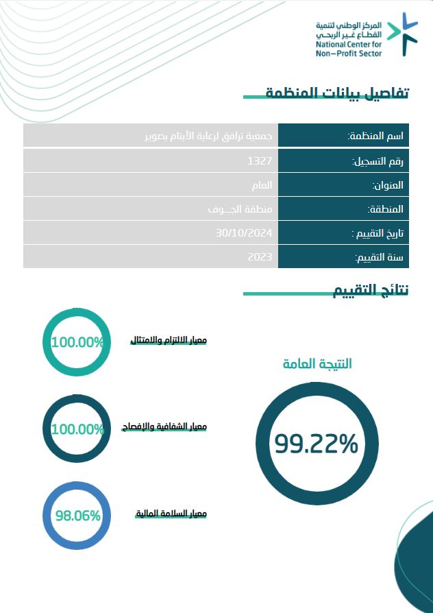 حصلت جمعية ترافق لرعاية الأيتام بمحافظة بصوير بمنطقة الجوف على درجة% 99.22 في تقييم الجهات غير ربحية لعام 2023 م ،من المركز الوطني للقطاع غير الربحي.