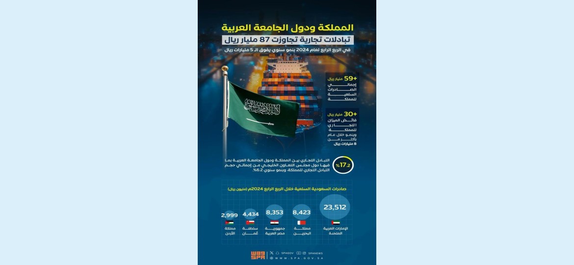 وفي إطار مسيرة النمو الاقتصادي الذي تشهده المملكة، سجّل إجمالي أحجام التبادلات التجارية بين المملكة ودول الجامعة العربية بما فيها دول مجلس التعاون لدول الخليج العربي نحو 87,768 مليار ريال سعودي تقريبًا خلال الربع الرابع 2024م، وذلك بحسب مجموعات الدول، ليشّكل هذا التبادل التجاري نحو 17.2% من إجمالي التبادلات التجارية للمملكة مع دول العالم الخارجي كافة، والبالغ نحو 510,974 مليارات ريال سعودي تقريبًا؛ لتحقق بذلك نموًا سنويًا يُقدر نسبته بـ 6.2%، وبقيمة زيادة تجاوزت الـ 5 مليارات ريال، مقارنة بنفس الفترة من العام 2023م، التي كانت تبلغ نحو 82,679 مليار ريال.