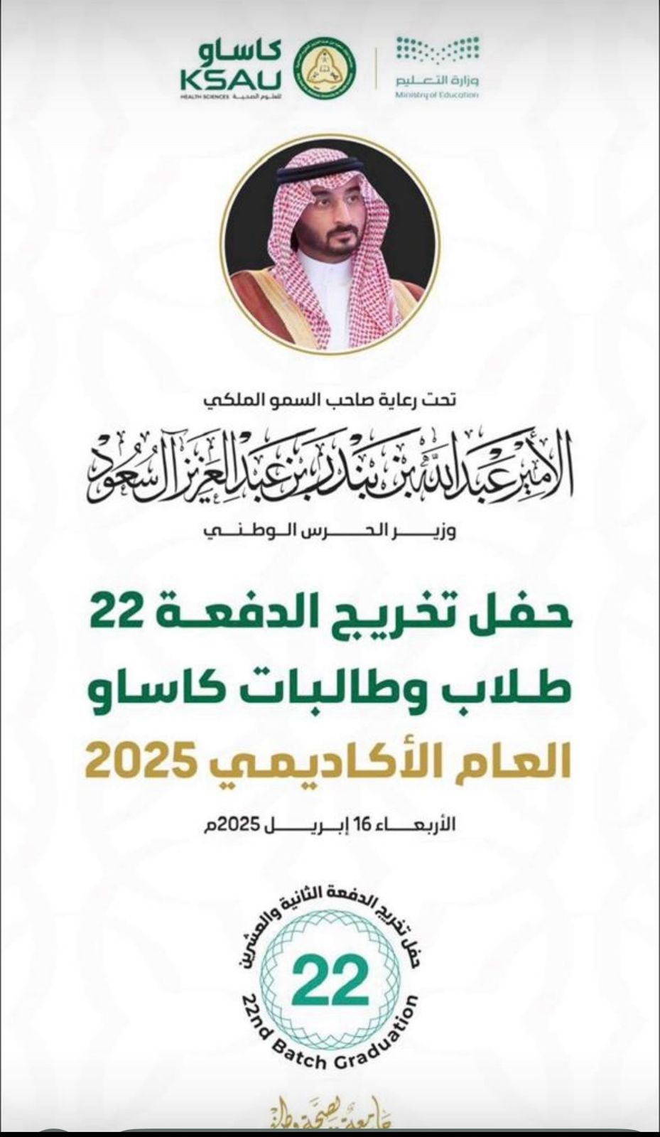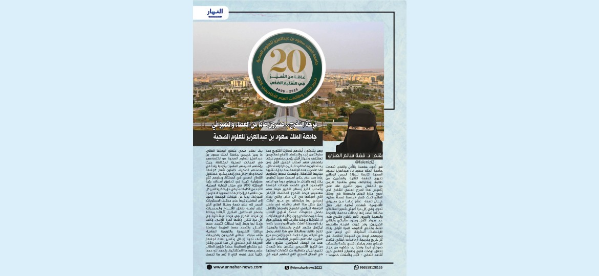 في أجواء مفعمة بالأمل والفخر، شهدت جامعة الملك سعود بن عبدالعزيز للعلوم الصحية التابعة لوزارة الحرس الوطني تخريج الدفعة الثانية والعشرين من طلابها وطالباتها، وهي مناسبة تتزامن مع الاحتفال بمرور عشرين عاماً على تأسيس هذا الصرح العلمي الشامخ الذي أصبح منارة للعلم والمعرفة في وطننا الغالي تحت شعار "جامعة لصحة وطن".