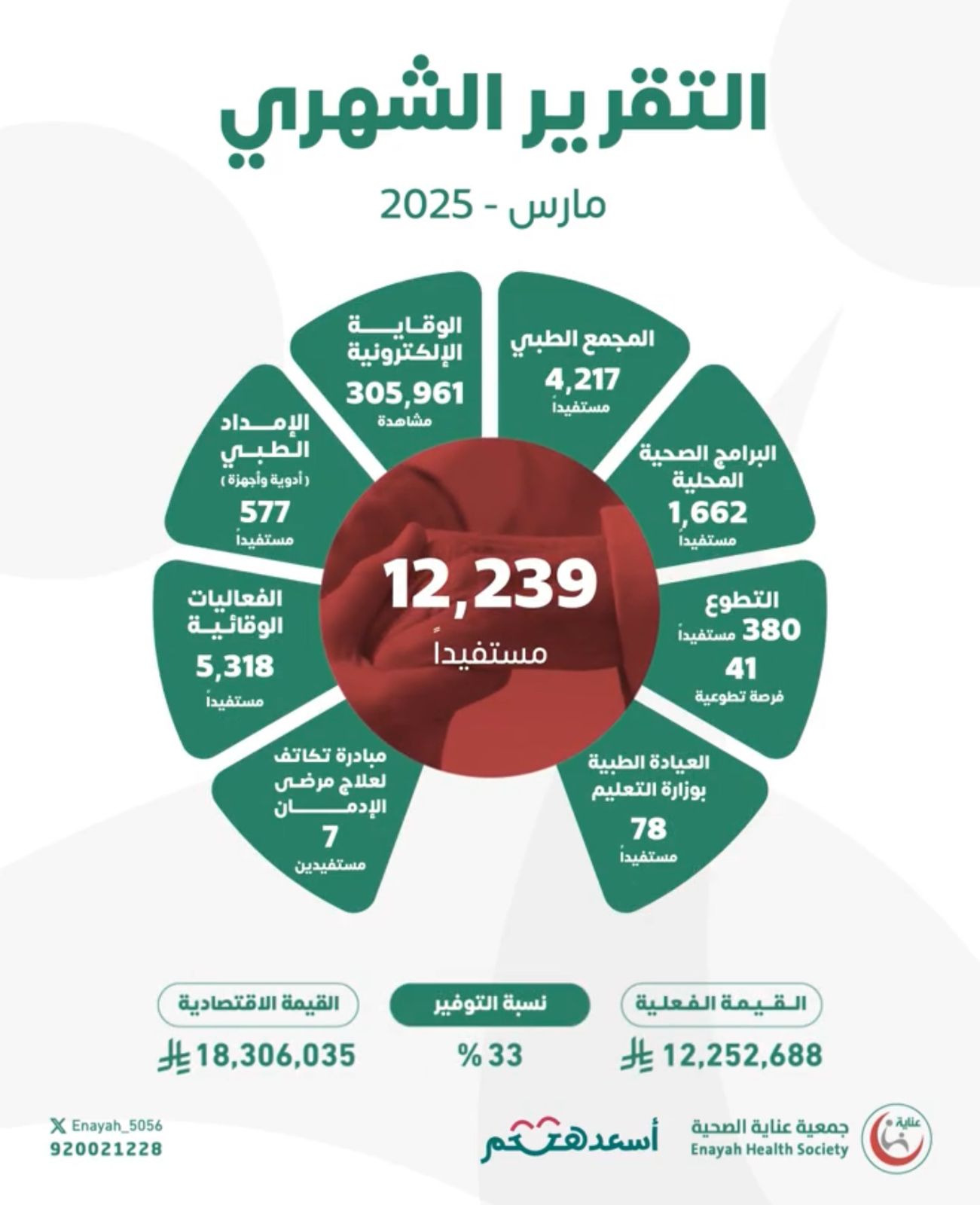 صرح الأمين العام للجمعية، الدكتور سلمان بن عبد الله المطيري بأن خدمات الجمعية الصحية وصلت إلى 12,239 مستفيدًا خلال شهر مارس، بقيمة اقتصادية تجاوزت 18,306,035 ريالًا، ومن بين هذه الخدمات، تمت معالجة 1,662 حالة ضمن البرامج الصحية المحلية، بقيمة اقتصادية 15,952,734 ريالًا، حيث ساهمت الخصومات المقدمة من شركاء النجاح في تحقيق توفير بنسبة 29% وتقليل التكلفة الإجمالية، مما ساعد على توسيع الأثر الصحي في المجتمع.