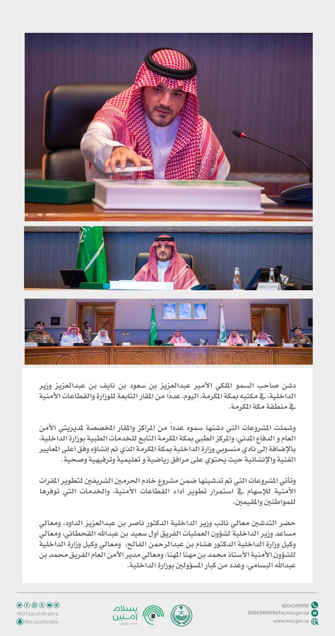 📄 | الأمير عبدالعزيز بن سعود يدشن عدد من المقار التابعة للوزارة والقطاعات الأمنية في منطقة مكة المكرمة.