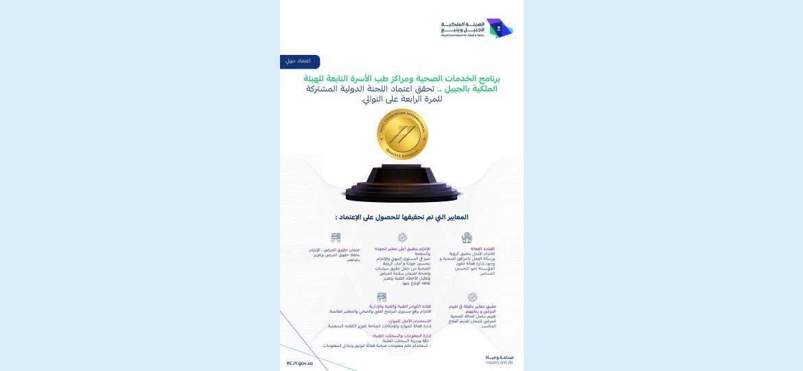 حققت الهيئة الملكية بالجبيل ممثلة في برنامج الخدمات الصحية ومراكز طب الاسرة بمدينة الجبيل الصناعية على شهادة الاعتراف الدولي من قبل اللجنة الدولية المشتركة لاعتماد المنشآت الصحية (JCI) للمرة الرابعة على التوالي، وذلك عقب تطبيق البرنامج للمعايير المطلوبة والتي انعكست على تطور الأداء وسير العمل بكفاءة للتقليل من المخاطر التي تواجه المرضى والعاملين، بالإضافة إلى توفير بيئة صحية مطابقة لمعايير السلامة الدولية.