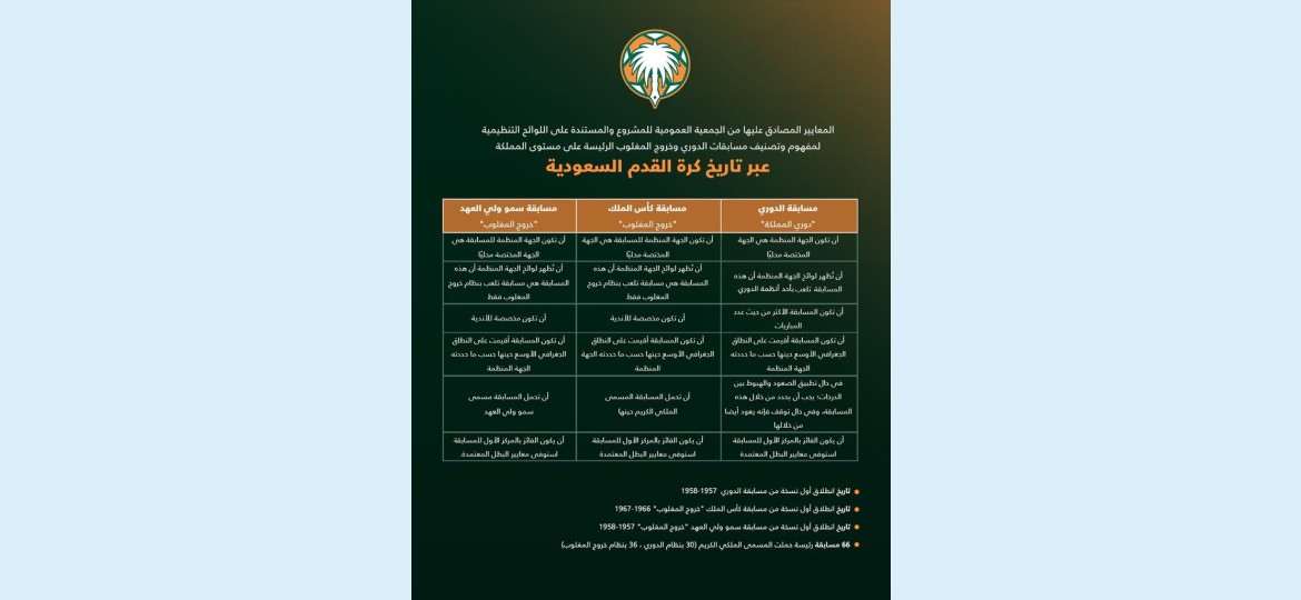 وتوصل فريق العمل أن الموسم الرياضي 1957 / 1958 هو انطلاقة الدوري السعودي (دوري المملكة)، وبذلك تكون نسخة الموسم الرياضي الحالي من الدوري السعودي للمحترفين "دوري روشن" هي النسخة رقم 68 على مدى التاريخ (منها 63 نسخة اكتملت وتحدد أبطالها إضافة إلى النسخة الحالية، وتوقفت 4 نسخ، ولم تستكمل لأسباب مختلفة)، إضافة إلى ما رصده فريق العمل من المسابقات التي أقيمت على مختلف الدرجات التصنيفية والجغرافية بأنظمة الدوري وخروج المغلوب خلال تاريخ كرة القدم السعودية.