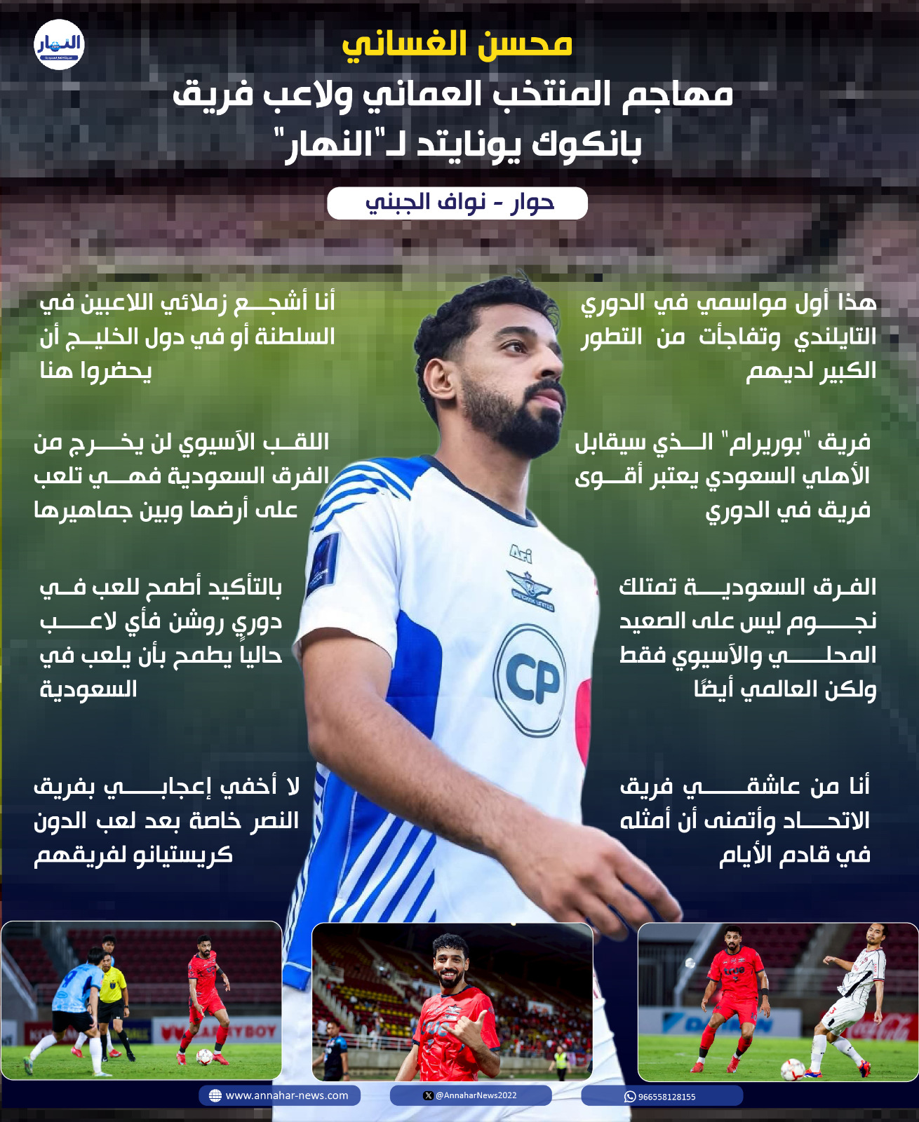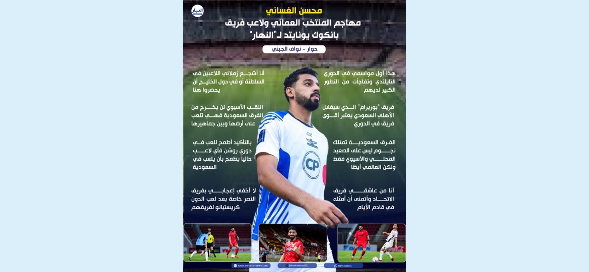 محسن الغساني مهاجم المنتخب العماني ولاعب فريق بانكوك يونايتد وثاني هدافي الدوري التايلندي وذلك في أول ثاني تجربة احترافية له خارج سلطنة عمان يتحدث بشكل حصري لصحيفة النهار السعودية عن مباراة الأهلي السعودي وبوريرام التايلندي والتي تلعب ضمن دور الـ 8 من دوري أبطال النخبة الآسيوية.