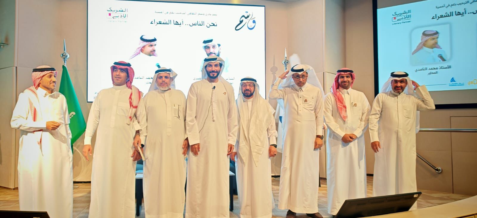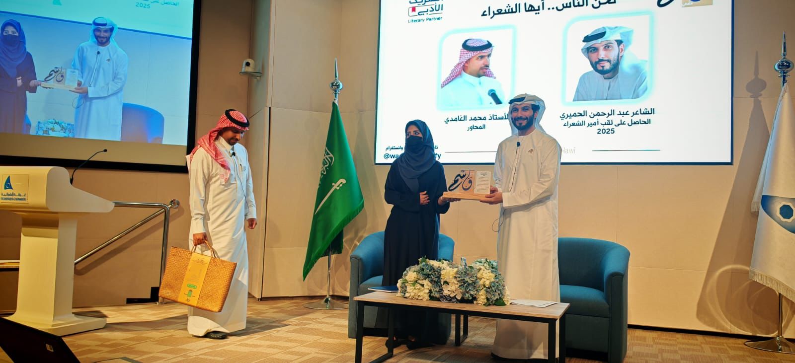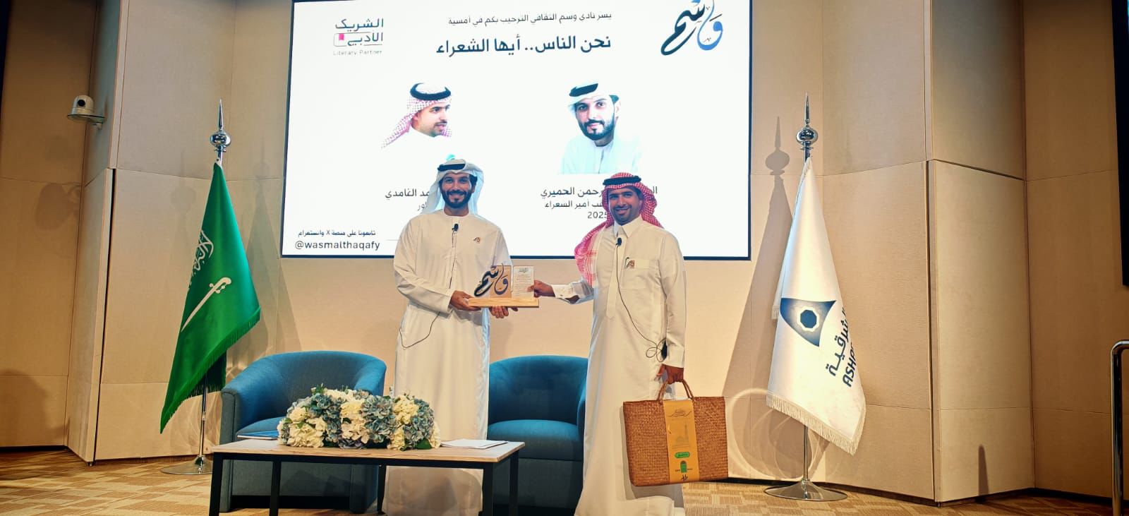 بحضور عدد من الشخصيات الثقافية والاجتماعية والإعلامية والمهتمين ابدع الشاعر عبدالرحمن الحميري الفائز بلقب أمير الشعراء في نسخته الأخيرة في حضوره وتألق شعراً في سماء المنطقة الشرقية في الأمسية التي نظمها نادي وسم الثقافي ضمن مبادرة الشريك الأدبي وذلك مساء يوم الاربعاء الماضي ٢٣ أبريل ٢٠٢٥ م على مسرح قاعة سعد المعجل بغرفة الشرقية حيث قدم الشاعر عبدالرحمن عدد من القصائد المميزة التي نالت استحسان الحضور في جمال الكلمة والمعنى حيث تفاعل الشاعر كثيراً مع الحضور .