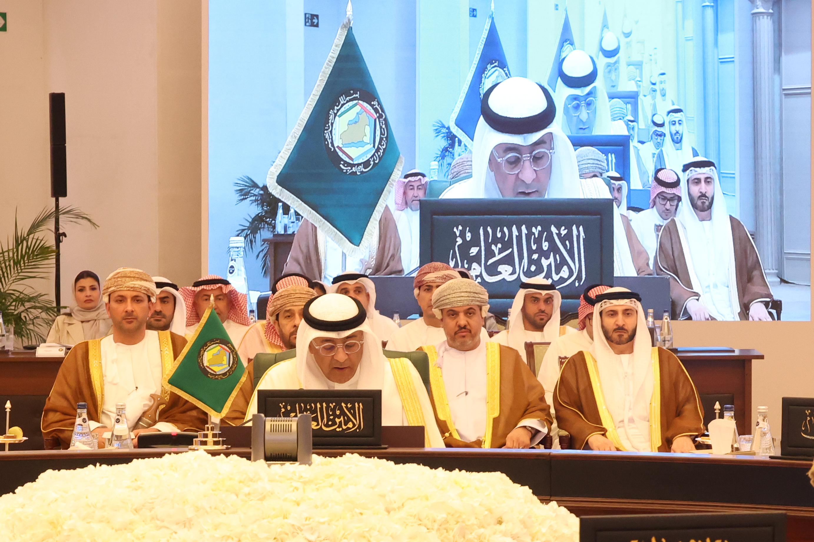 في مستهل كلمته رفع معالي الأمين العام أسمى آيات الشكر والتقدير والامتنان، إلى مقام حضرة صاحب السمو الشيخ مشعل الأحمد الجابر الصباح، أمير دولة الكويت - حفظه الله ورعاه-، رئيس الدورة الحالية للمجلس الأعلى، على ما يقدمه سموه ولأصحاب الجلالة والسمو قادة دول مجلس التعاون-حفظهم الله ورعاهم- من دعم ومساندة لمسيرة العمل الخليجي المشترك، تحقيقاً لتطلعات مواطني دول المجلس نحو مزيد من التعاون والتكامل، سائلاً المولى جلت قدرته أن يديم على دولة الكويت نعمة الأمن والأمان والازدهار.