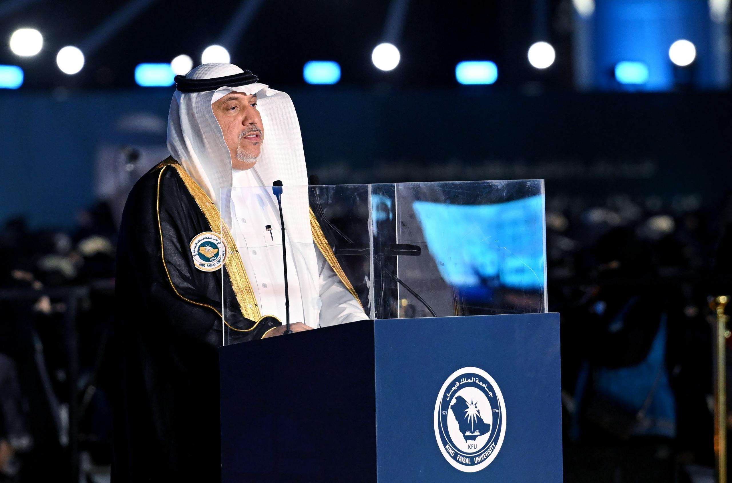 وألقى رئيس الجامعة الأستاذ الدكتور عادل بن محمد أبو زناده كلمةً عبّر فيها عن شكره وتقديره لسمو أمير المنطقة الشرقية على رعايته لهذا المحفل العلمي، ولسمو نائب أمير المنطقة الشرقية على تشريفه، وسمو محافظ الأحساء على حضوره، مؤكدًا أن هذا الدعم يحفز الجامعة على مواصلة رسالتها الوطنية في إعداد الكفاءات الوطنية المتميزة، والمساهمة الفاعلة في تحقيق مستهدفات رؤية المملكة 2030.