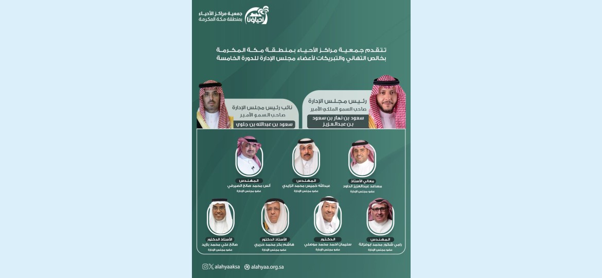 اعتمد المركز الوطني لتنمية القطاع غير الربحي تشكيل مجلس إدارة جمعية مراكز الأحياء بمنطقة مكة المكرمة للدورة الخامسة، حيث صدر قرار بتعيين صاحب السمو الأمير سعود بن نهار محافظ الطائف رئيسًا لمجلس الإدارة، وصاحب السمو الأمير سعود بن جلوي محافظ جدة نائبًا للرئيس.