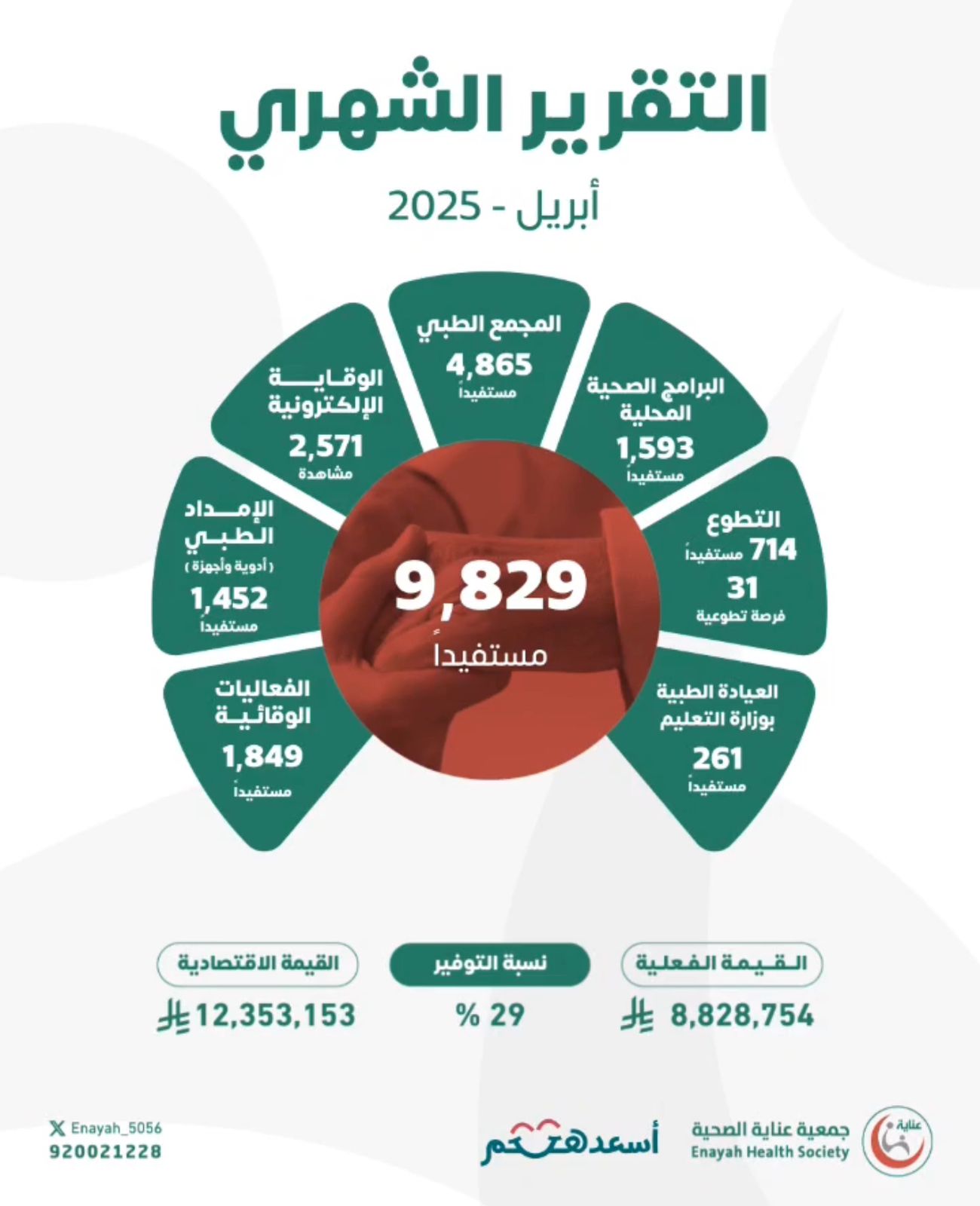 وأوضح الأمين العام للجمعية الدكتور سلمان بن عبد الله المطيري، أن خدمات الجمعية الصحية وصلت إلى 9,829 مستفيدًا خلال شهر أبريل، بقيمة اقتصادية تقدر بـ 12,353,153 ريالًا.