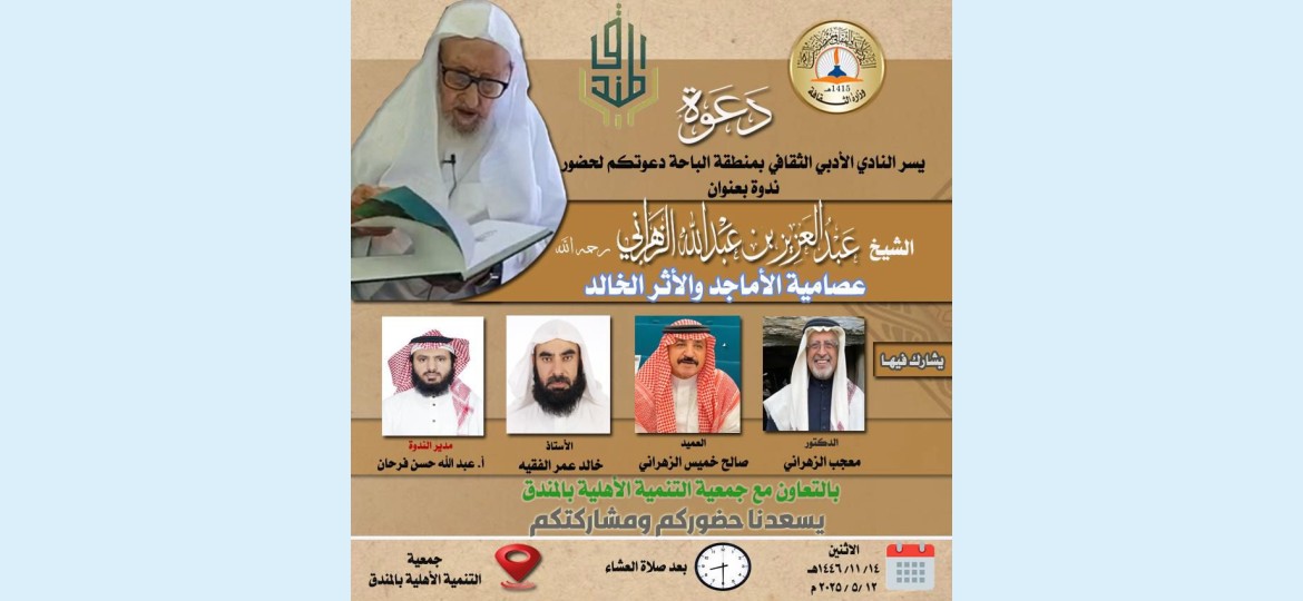 في بادرة وفاء غير مستغربة من نادي الباحة الأدبي الثقافي، يقيم النادي بالشراكة مع جمعية التنمية الأهلية بالمندق ندوة ثقافية بعنوان: "الشيخ عبد العزيز بن عبد الله الزهراني رحمه الله.. (عصامية الأماجد والأثر الخالد)".