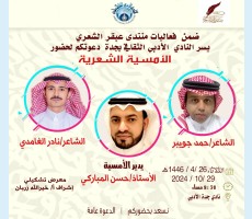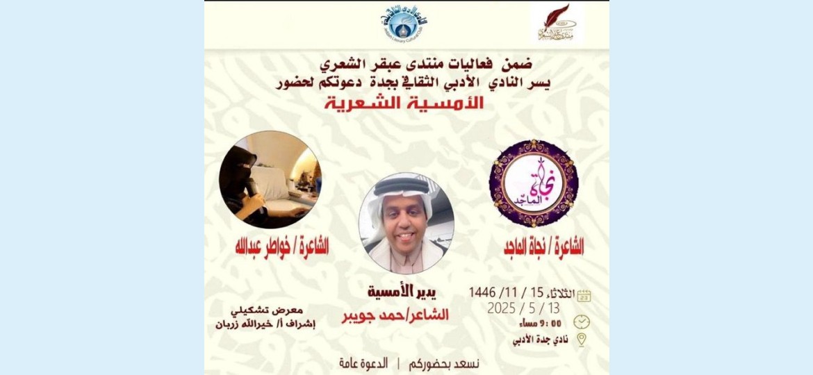 يقيم منتدى عبقر الشعري بالنادي الأدبي بجدة مساء غدا الثلاثاء 15 ذي القعدة، أمسية شعرية يشارك فيها كل من الشاعرة نجاة الماجد، والشاعرة خواطر عبدالله ويديرها الشاعر حمد جويبر، عند الساعة التاسعة مساء بقاعة مكتبة النادي، كما يصاحب الأمسية معرض تشكيلي مصغر للجنة الفنون البصرية بالنادي تحت أشراف الاستاذ خيرالله زربان.