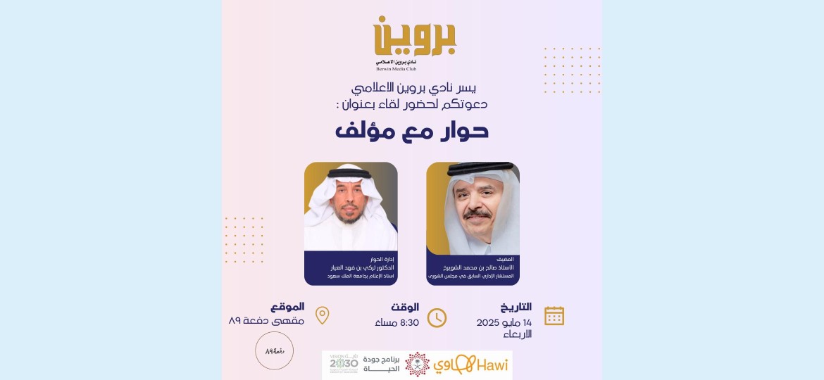 يقيم نادي بروين الإعلامي ضمن انشطته أمسية ثقافية بعنوان حوار مع مؤلف ويستضيف الأستاذ صالح بن محمد الشويرخ المستشار الأدبي السابق في مجلس الشورى ويدير الحوار الدكتور تركي بن فهد العيار أستاذ الإعلام بجامعة الملك سعود.