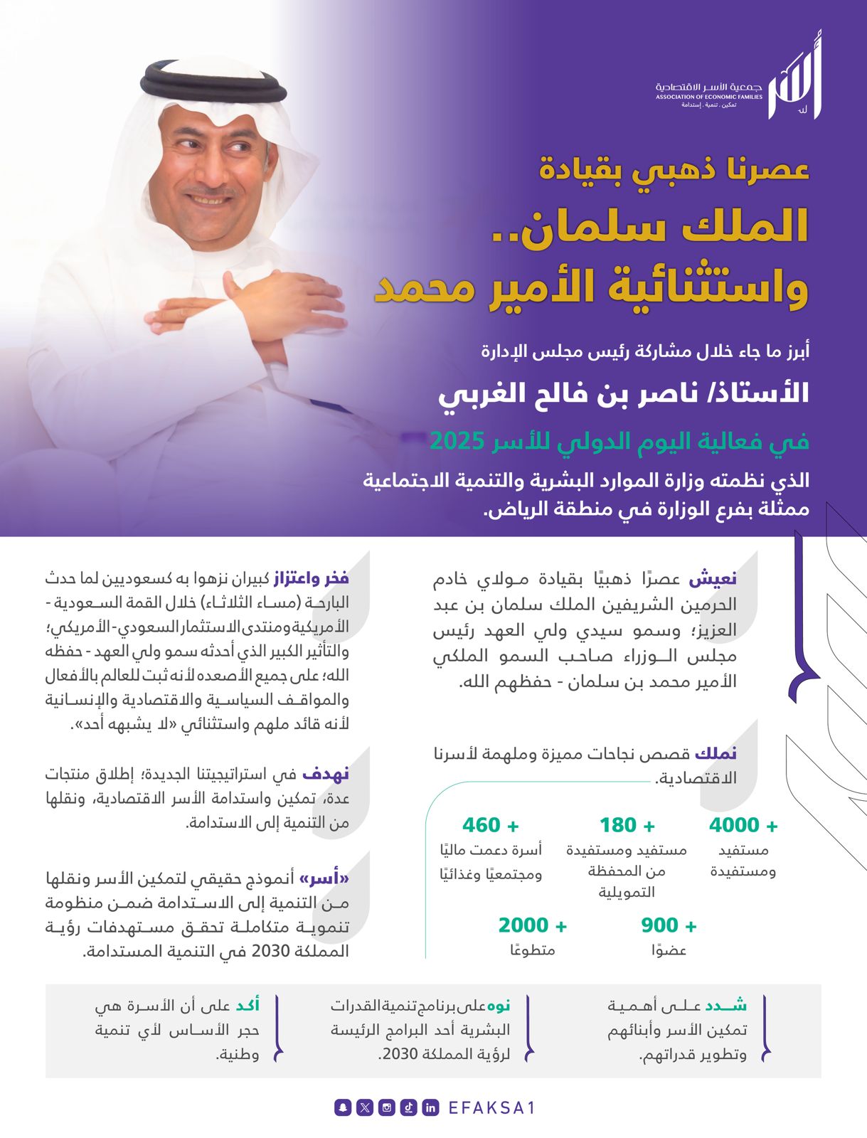 جاء ذلك لمشاركته كمتحدث رئيس في الجلسة الحوارية الرئيسة التي أقيمت ضمن فعالية اليوم الدولي للأسر 2025، الذي نظمته وزارة الموارد البشرية والتنمية الاجتماعية ممثلةً بفرع الوزارة في منطقة الرياض بعنوان "تحليل السياسات الأسرية في ضوء رؤية 2030 والتنمية المستدامة"، اليوم الأربعاء 14 مايو 2025، في فرع فرع الوزارة في مدينة الرياض، حيث استعرض دور الجمعية في دعم الأسر الاقتصادية وتمكينها لتحقيق الاكتفاء الذاتي والمساهمة في التنمية الوطنية.