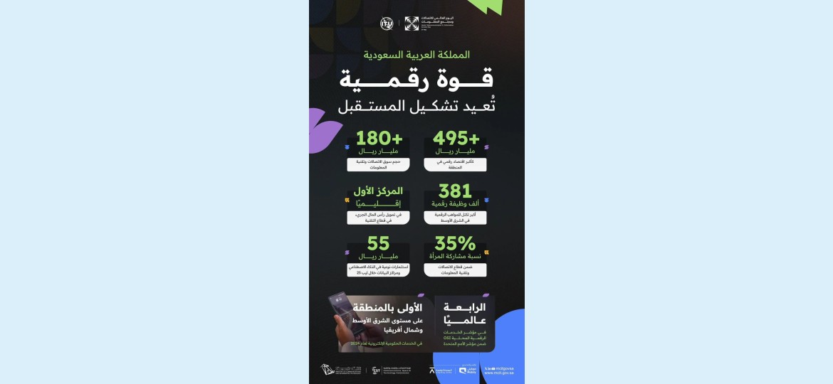وفي الوقت الذي تحتفل فيه دول العالم باليوم العالمي للاتصالات ومجتمع المعلومات، تبرز المملكة بصفتها أكبر اقتصاد رقمي في منطقة الشرق الأوسط وشمال أفريقيا، بقيمة تتجاوز (495) مليار ريال، تمثل (15%) من الناتج المحلي الإجمالي؛ مما يعكس تحولًا جذريًّا في بنية الاقتصاد الوطني، ونجاح المملكة في تنويع مصادر الدخل من خلال تسريع وتيرة الاقتصاد الذكي.