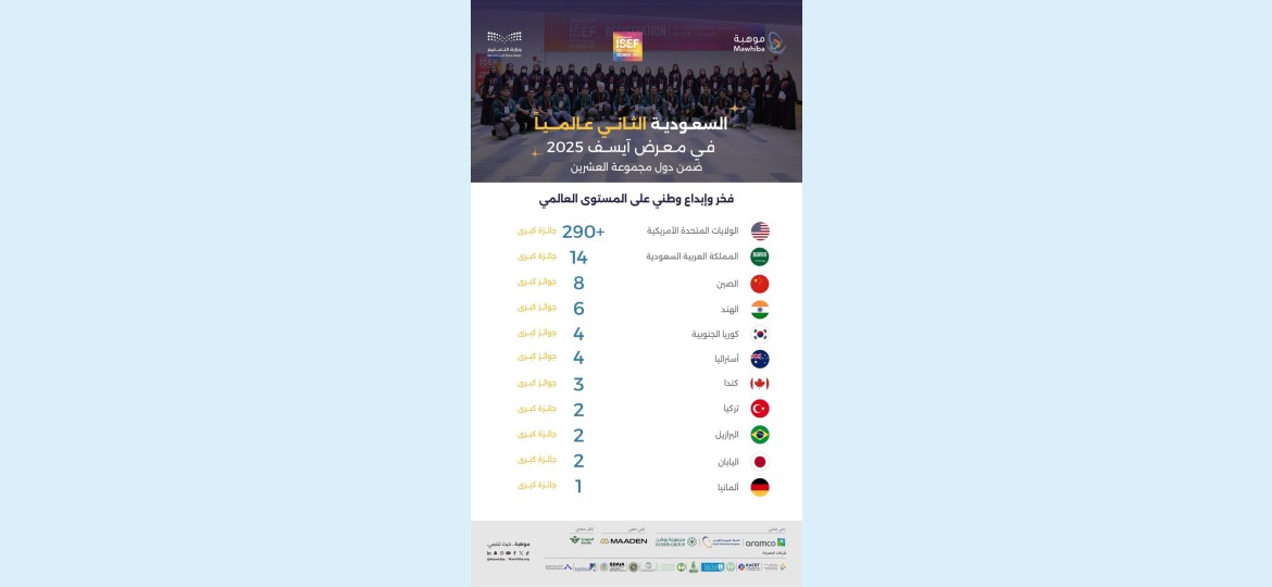 حقق المنتخب السعودي للعلوم والهندسة المركز الثاني بين دول مجموعة العشرين في منافسات آيسف 2025، التي شاركت فيها 70 دولة، بعد الولايات المتحدة الأمريكية التي تصدرت المراكز.
