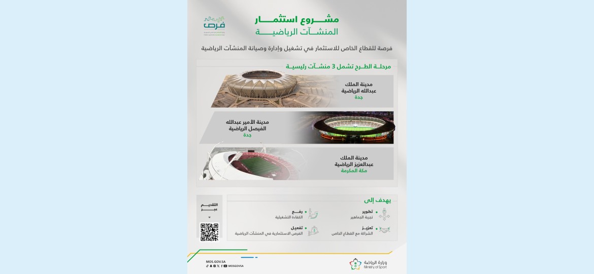 أعلنت وزارة الرياضة، اليوم الأثنين 19 مايو 2025م، عن إطلاق مشروع "استثمار المنشآت الرياضية"، والذي يشمل ثلاث مدن رياضية رئيسية، هي: مدينة الملك عبدالله الرياضية بجدة، ومدينة الأمير عبدالله الفيصل الرياضية بجدة، ومدينة الملك عبدالعزيز الرياضية بمكة المكرمة.